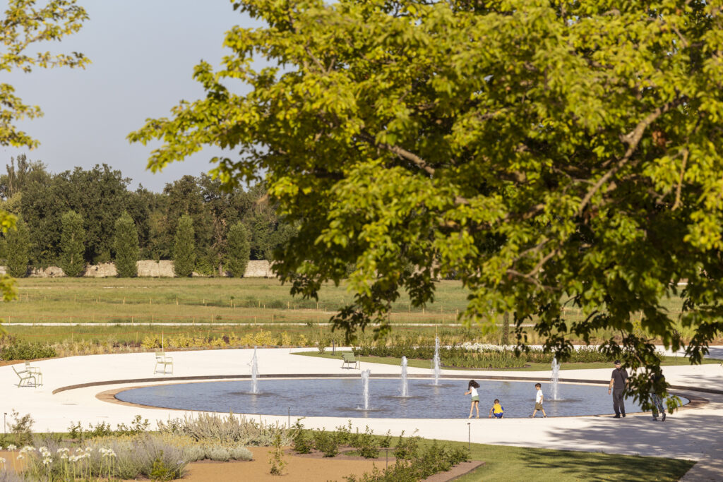 Cinque grandi pergolati emergono come punti di riferimento visibili, raggiungibili attraverso l'ampiezza dei prati. Elementi storici restaurati, come le vasche, le grotte e il belvedere, coesistono con elementi contemporanei, tra cui arredi in graniglia impreziositi da frammenti di vetro riciclato che riflettono la luce. Di notte, una moltitudine di punti luminosi garantisce la visibilità lungo il boulevard e valorizza il ruolo dei pergolati come spazi illuminati, immersi nel chiaroscuro del prato centrale.