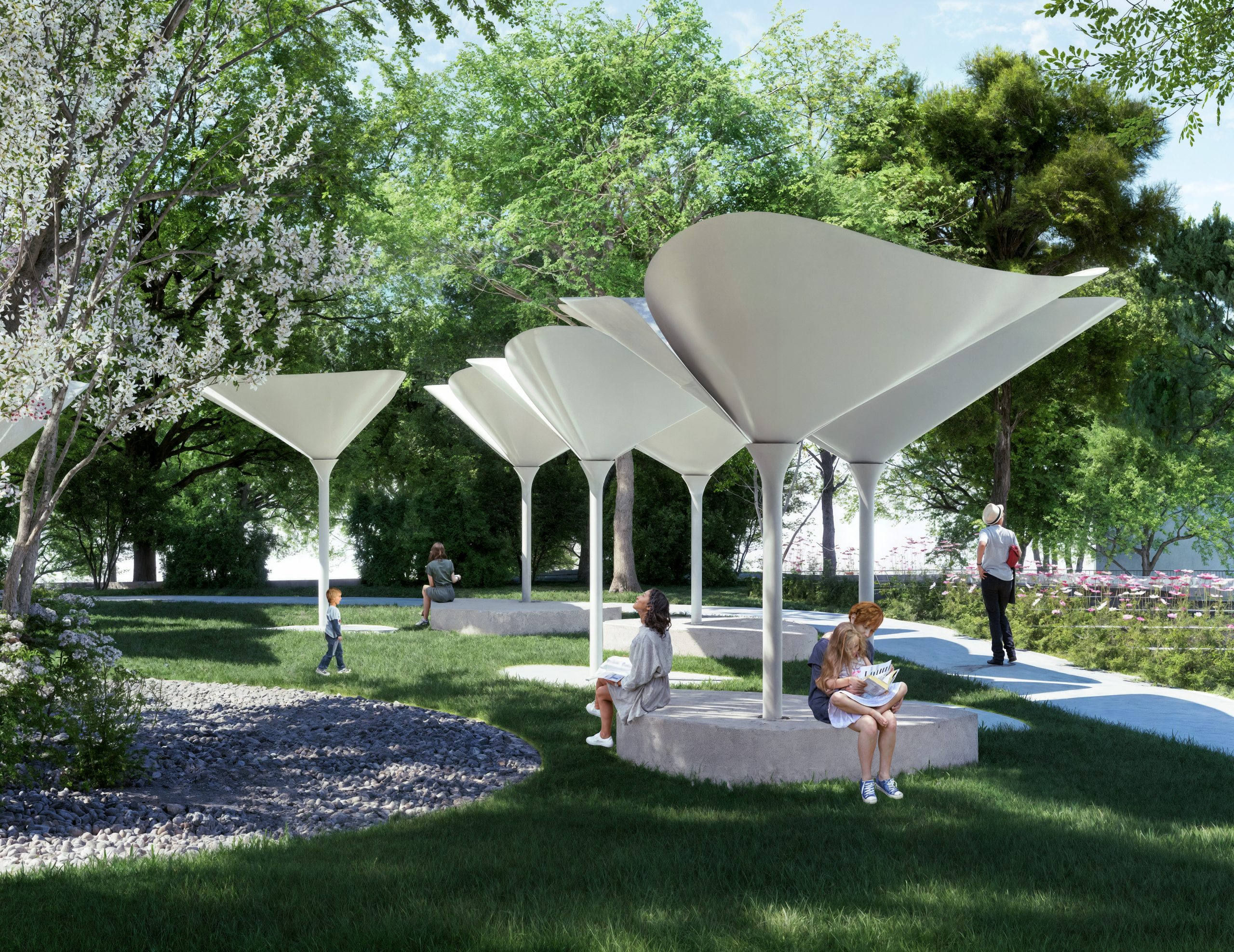 Le installazioni 3D si ispirano alla forma del carciofo in fioritura e sono disposte radialmente attorno al cuore del parco, generando un senso di centralità. Sono progettate per offrire più funzioni in un unico gesto architettonico: garantiscono ombra durante il giorno, integrano sedute per il relax, si illuminano di notte e raccolgono acqua piovana destinata all’irrigazione. Grazie ai micro-sistemi fotovoltaici interni, producono energia pulita per alimentare l’illuminazione.