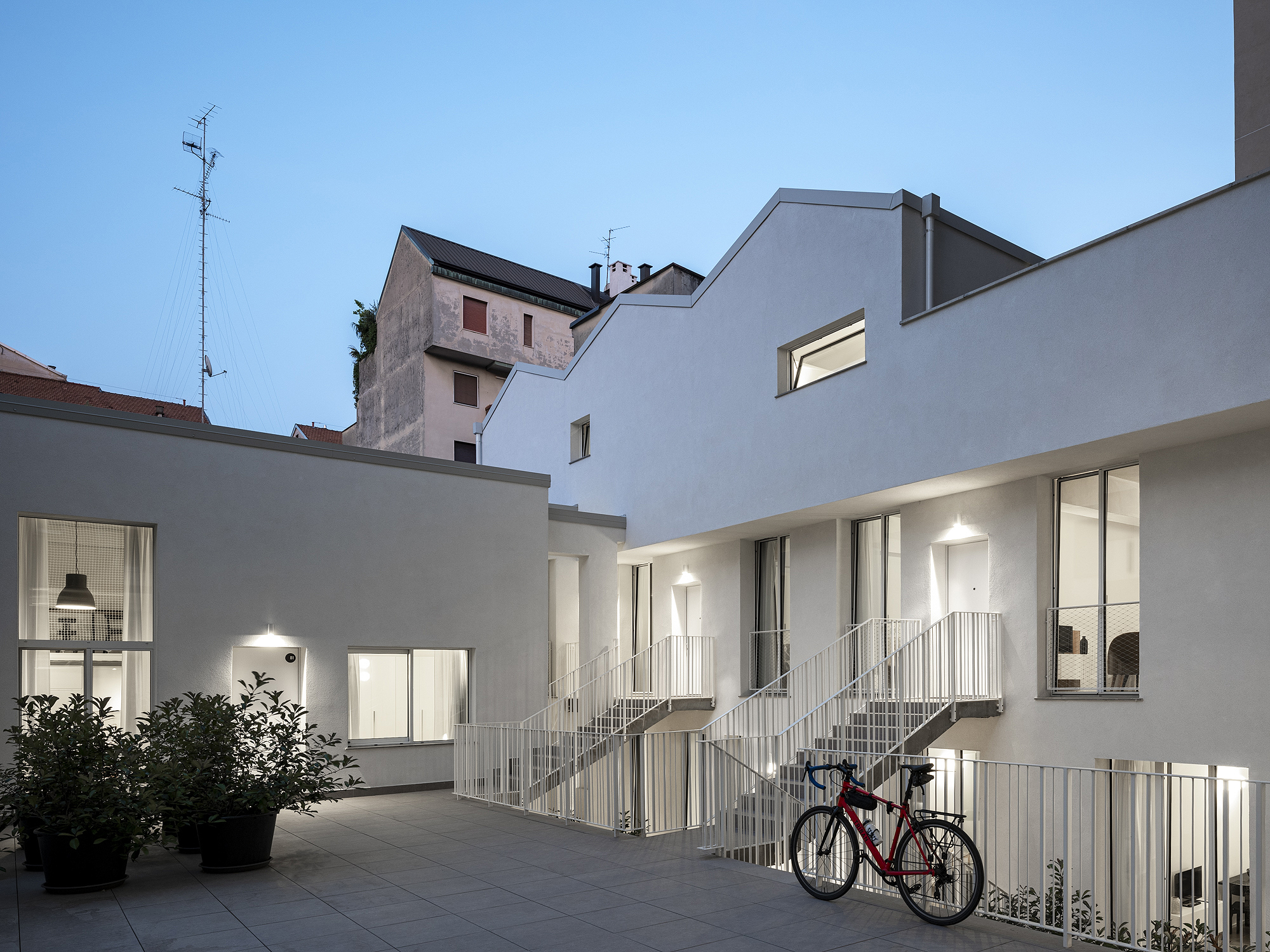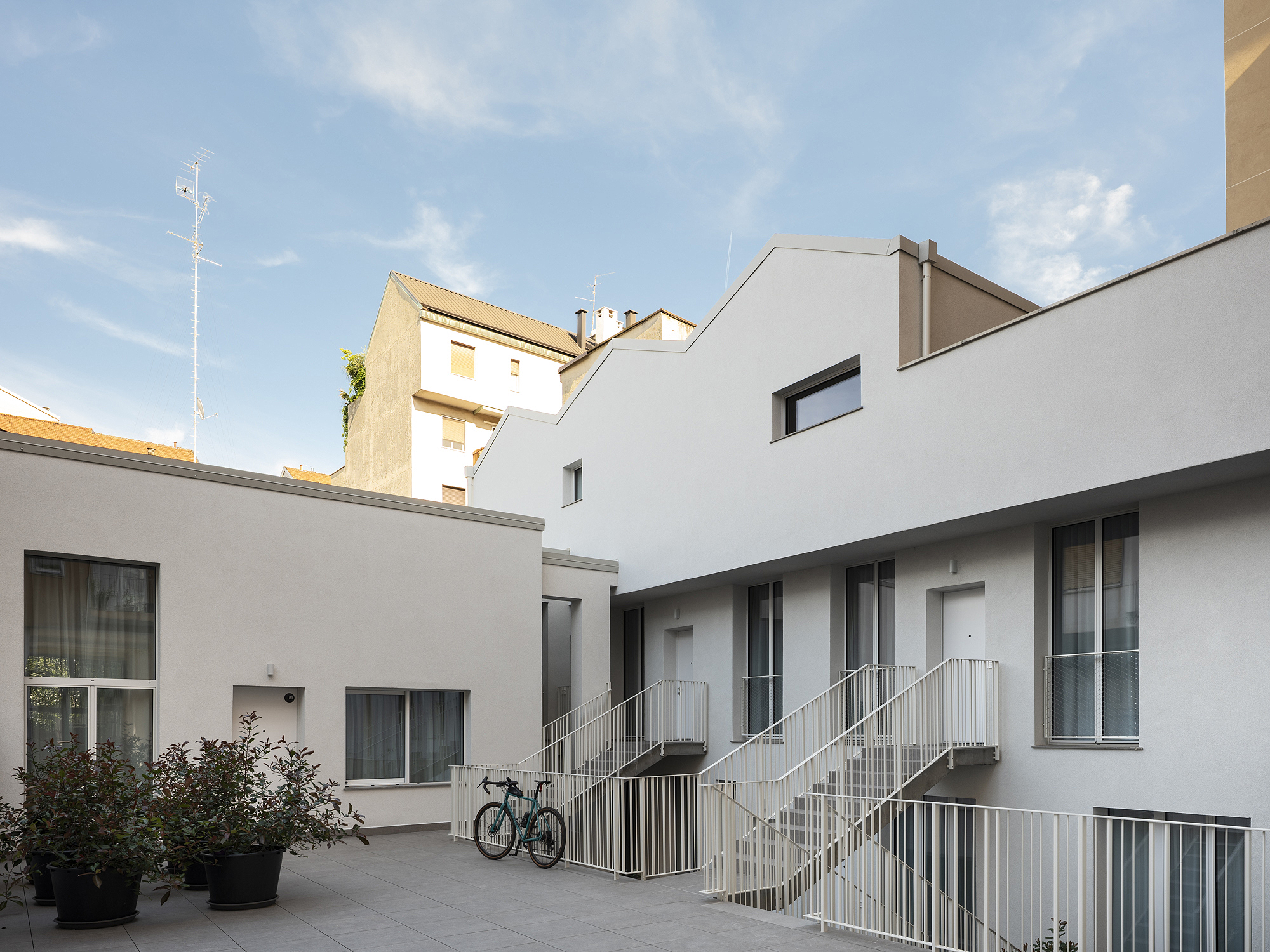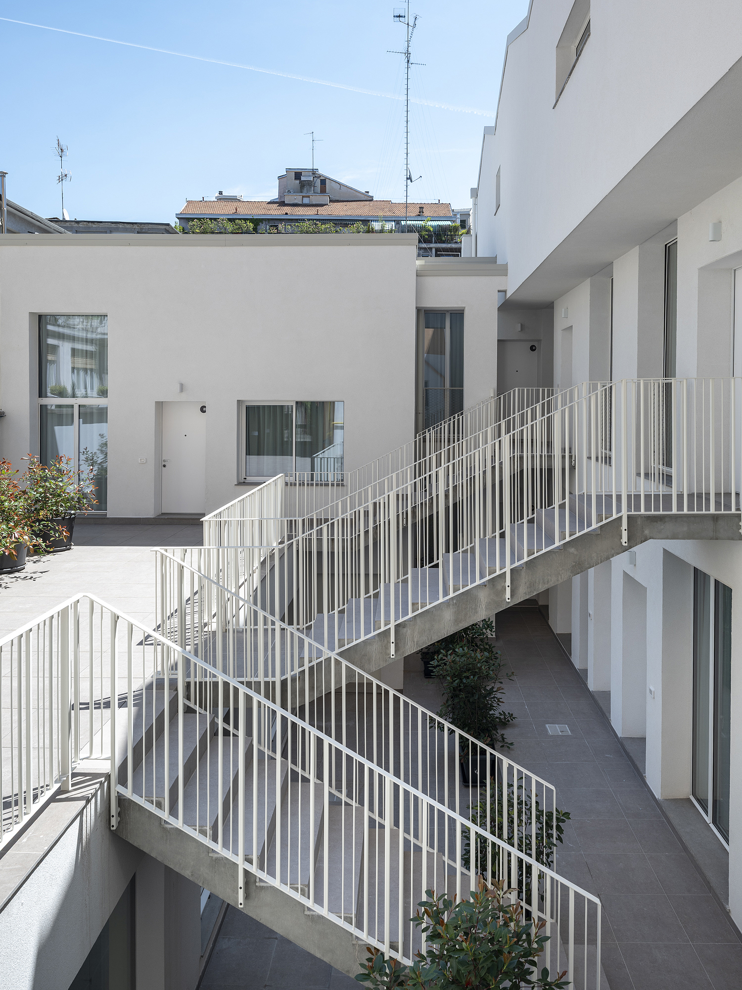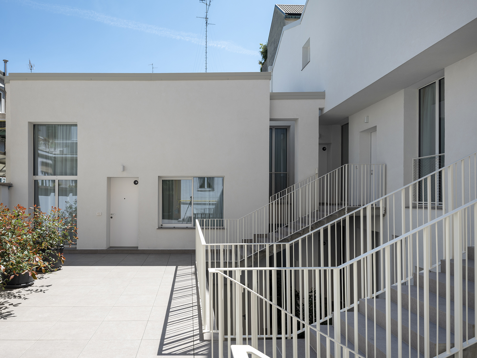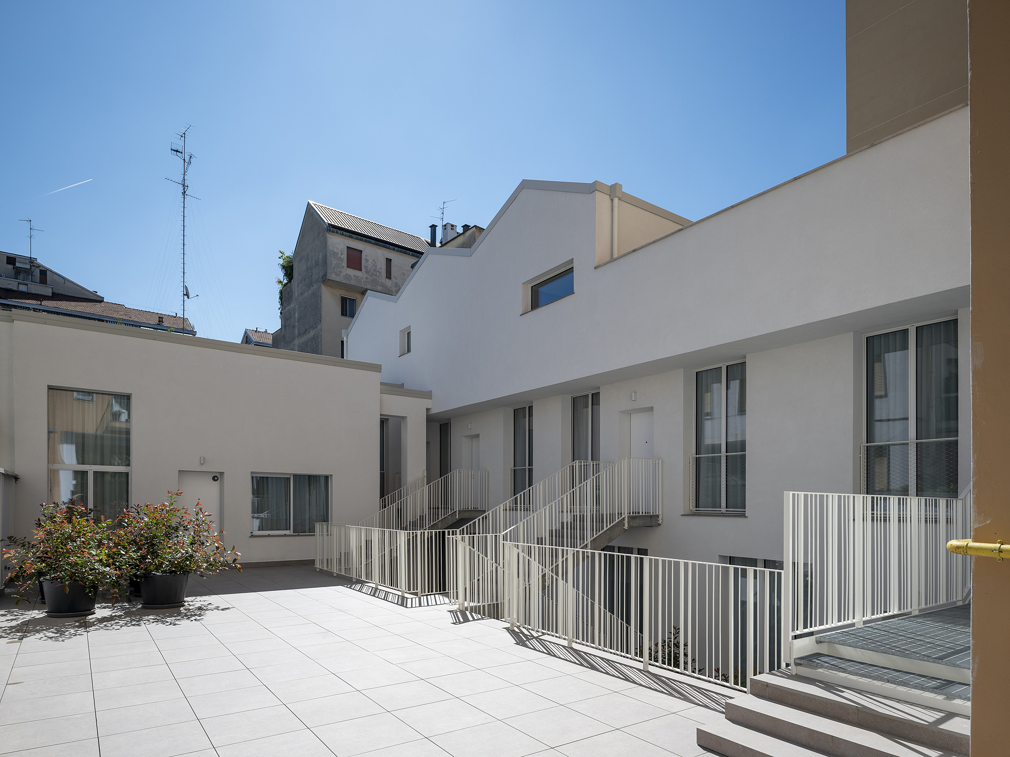 Il progetto interviene su un edificio a impianto a L che abbracciava due lati del cortile di un palazzo su strada e il principio del progetto è stata un attento rilievo dello stato di fatto. La strategia principale non è stata l’espansione volumetrica, ma la ridefinizione delle relazioni tra spazi interni ed esterni, la ridefinizione di nuovi ingressi e di un nuovo rapporto tra la corte e il costruito. L’operazione più incisiva riguarda il piano seminterrato, reso pienamente abitabile grazie all’abbassamento di una porzione della corte, trasformata in un patio ribassato articolato spazialmente da gradonate, sedute e superfici piantumate. Uno spazio prima residuale diventa così un luogo di vita condivisa, capace di mediare tra dimensione privata e collettiva, il cortile, sopraelevato che diventa una nuova piazza per gli abitanti.Il complesso ospita dieci unità abitative di piccolo e medio taglio – monolocali, bilocali e trilocali – tutte con accesso indipendente dal cortile, oltre a spazi comuni collocati sotto la corte: lavanderia, cantine, locale polifunzionale e ambienti di servizio. Un’ulteriore unità trova posto sulla terrazza, all’interno di un nuovo volume a falde che sostituisce i vecchi corpi tecnici e contribuisce a ricomporre l’immagine complessiva dell’edificio.Dal punto di vista architettonico, il progetto costruisce un linguaggio unitario attraverso superfici bianche, parapetti leggeri e grandi aperture vetrate che mettono in continuità visiva interni e spazio comune. La complessità volumetrica e altimetrica è governata con un disegno misurato, che restituisce ordine e riconoscibilità ricucendo un micro-frammento urbano con la città.