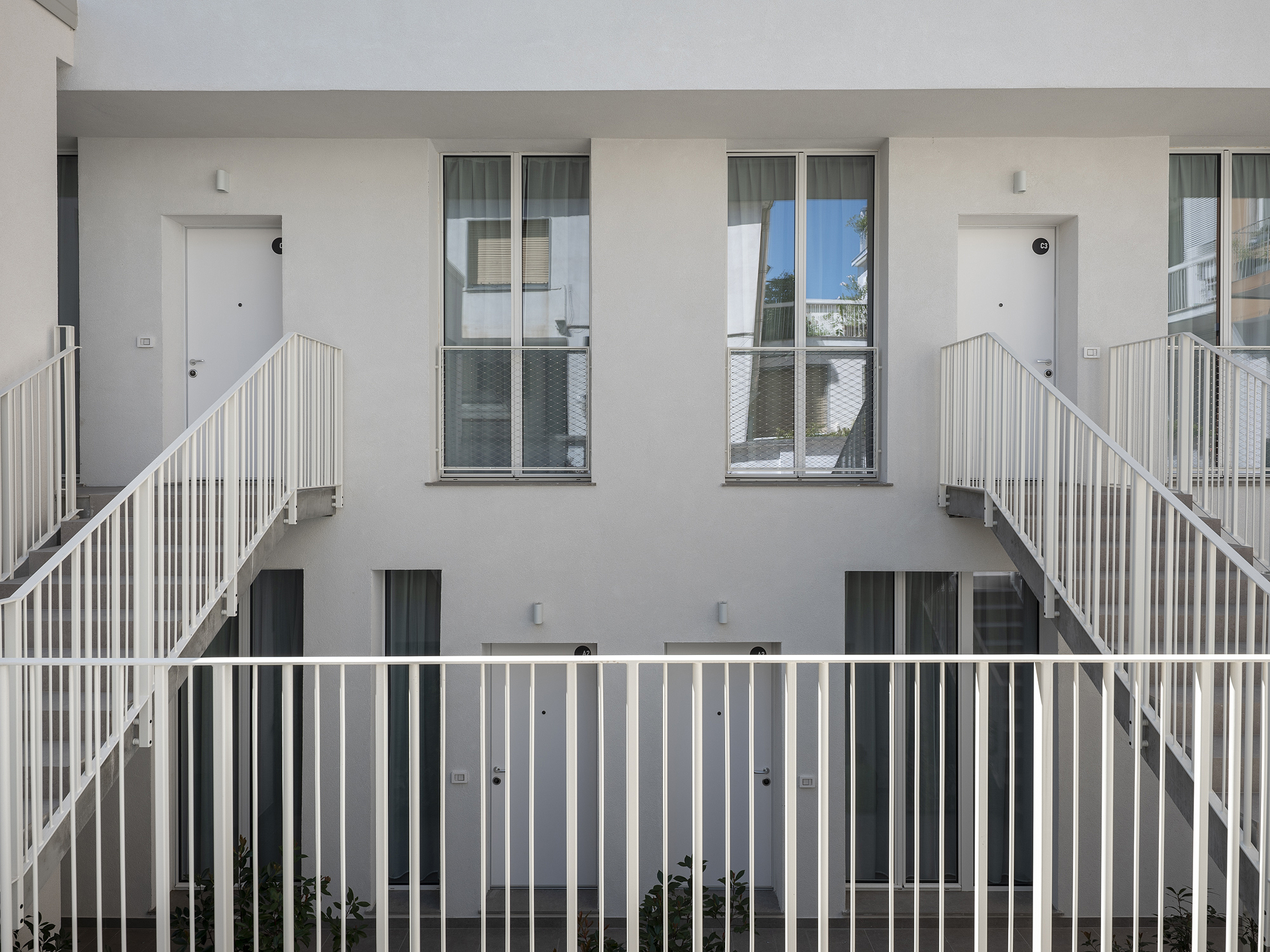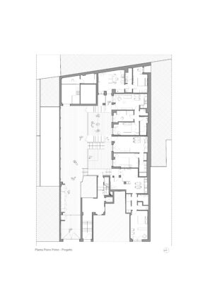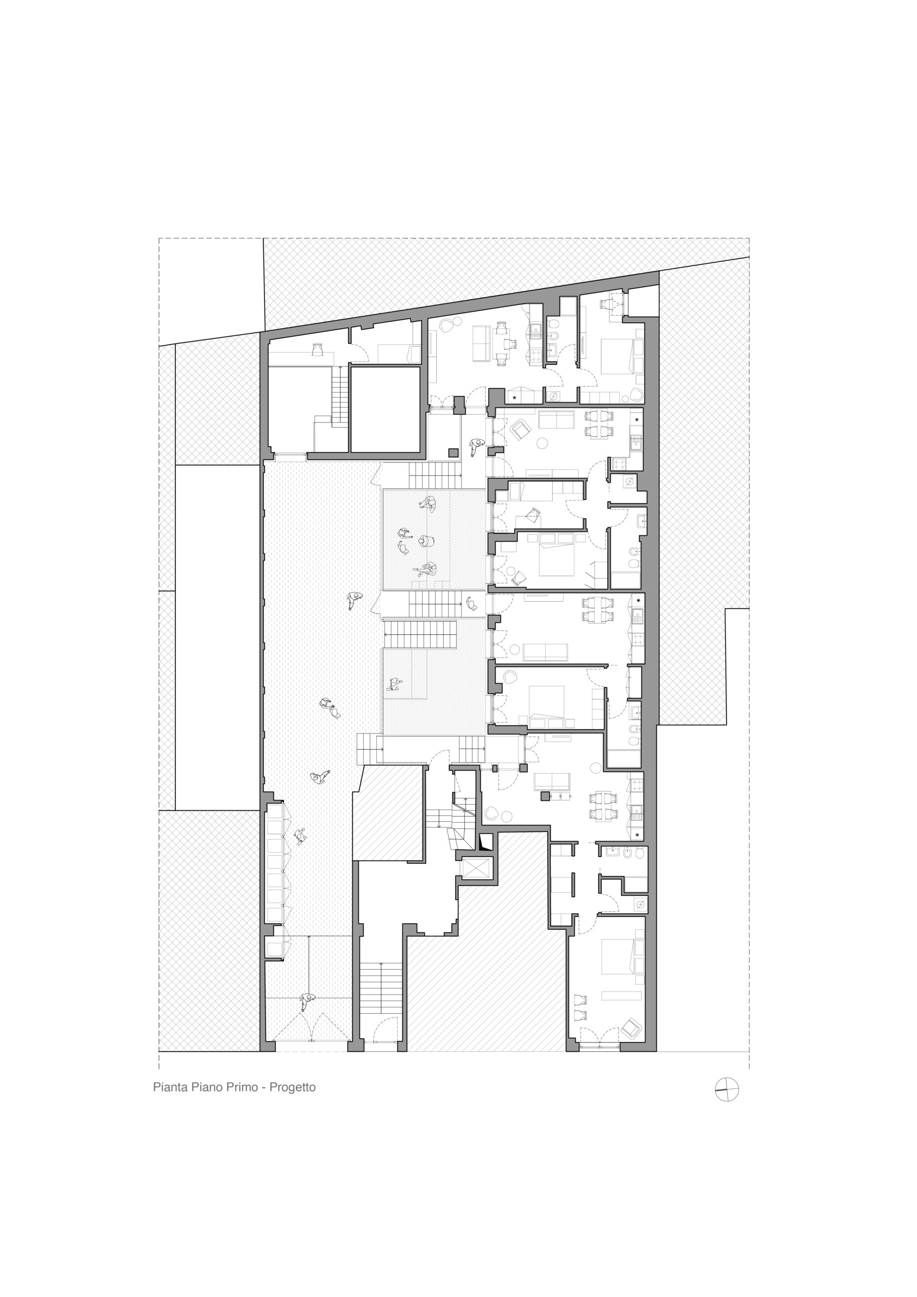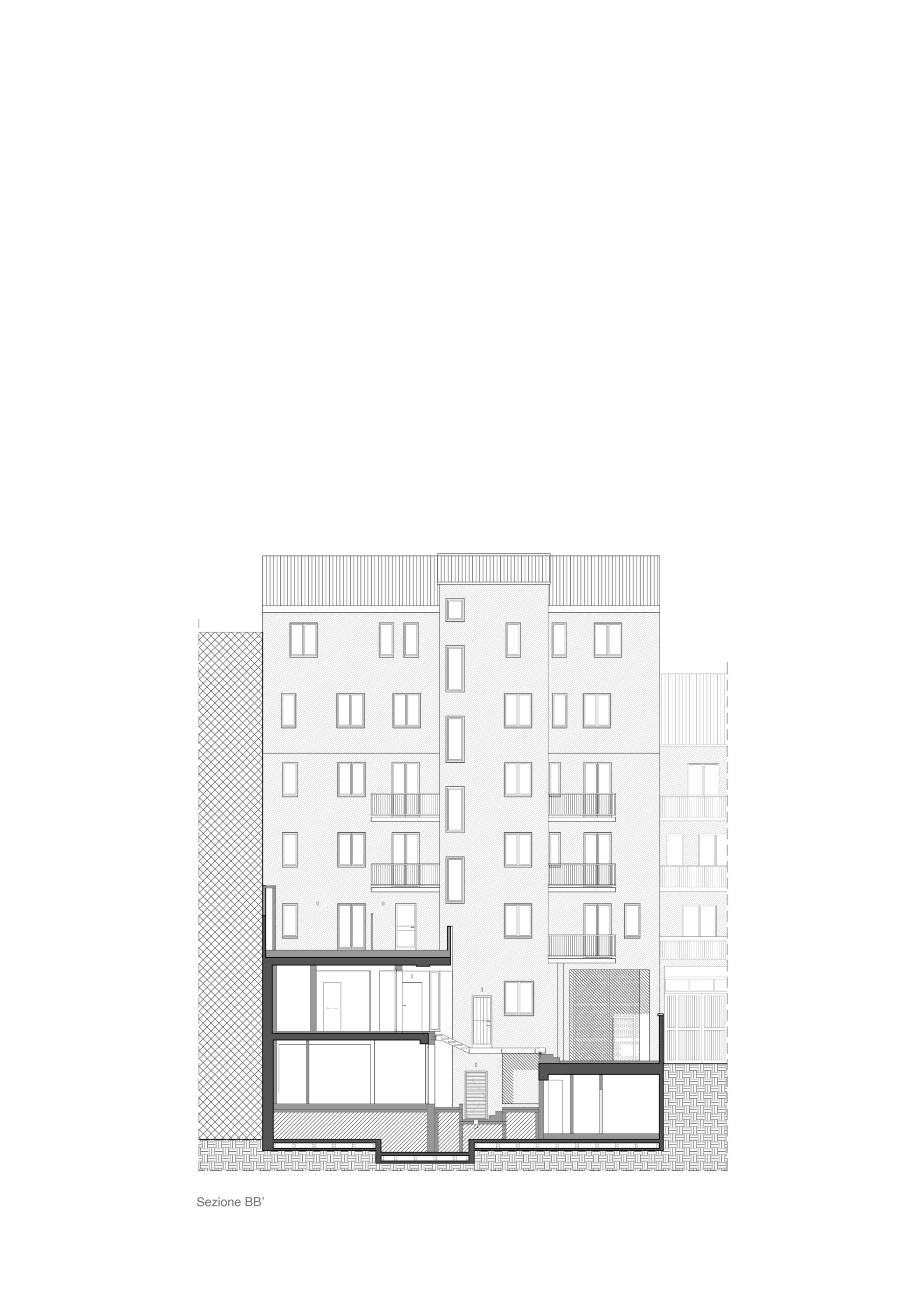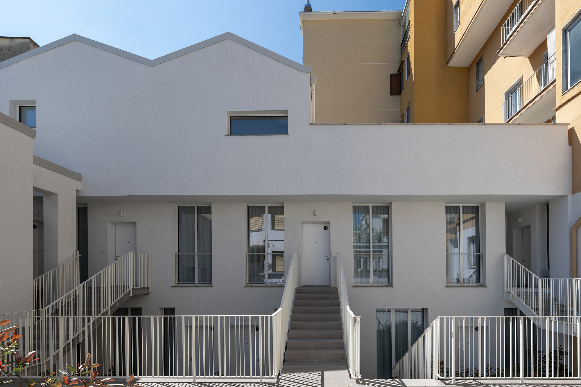 Il progetto interviene su un edificio a impianto a L che abbracciava due lati del cortile di un palazzo su strada e il principio del progetto è stata un attento rilievo dello stato di fatto. La strategia principale non è stata l’espansione volumetrica, ma la ridefinizione delle relazioni tra spazi interni ed esterni, la ridefinizione di nuovi ingressi e di un nuovo rapporto tra la corte e il costruito. L’operazione più incisiva riguarda il piano seminterrato, reso pienamente abitabile grazie all’abbassamento di una porzione della corte, trasformata in un patio ribassato articolato spazialmente da gradonate, sedute e superfici piantumate. Uno spazio prima residuale diventa così un luogo di vita condivisa, capace di mediare tra dimensione privata e collettiva, il cortile, sopraelevato che diventa una nuova piazza per gli abitanti.Il complesso ospita dieci unità abitative di piccolo e medio taglio – monolocali, bilocali e trilocali – tutte con accesso indipendente dal cortile, oltre a spazi comuni collocati sotto la corte: lavanderia, cantine, locale polifunzionale e ambienti di servizio. Un’ulteriore unità trova posto sulla terrazza, all’interno di un nuovo volume a falde che sostituisce i vecchi corpi tecnici e contribuisce a ricomporre l’immagine complessiva dell’edificio.Dal punto di vista architettonico, il progetto costruisce un linguaggio unitario attraverso superfici bianche, parapetti leggeri e grandi aperture vetrate che mettono in continuità visiva interni e spazio comune. La complessità volumetrica e altimetrica è governata con un disegno misurato, che restituisce ordine e riconoscibilità ricucendo un micro-frammento urbano con la città.