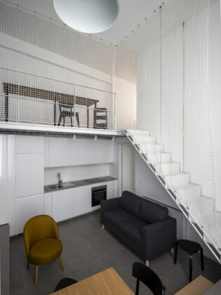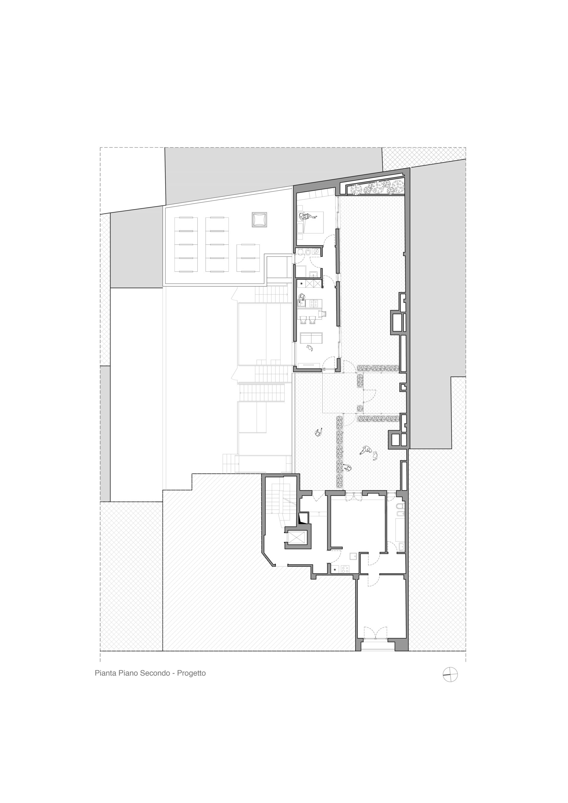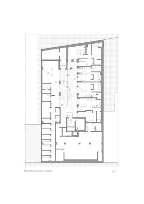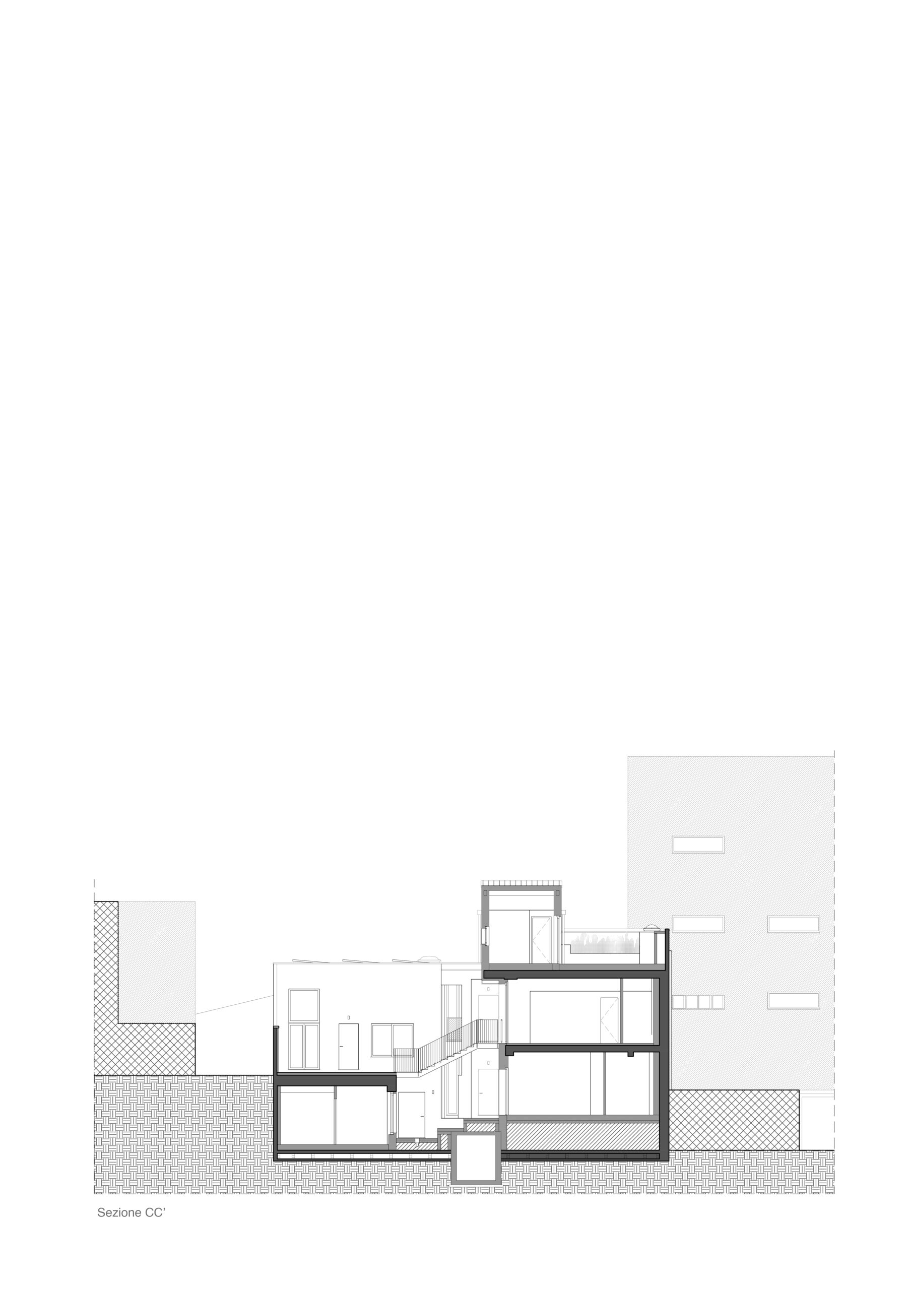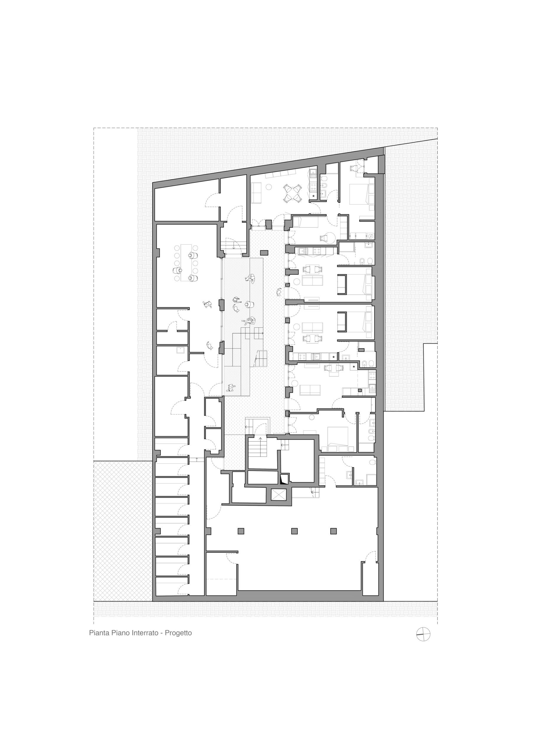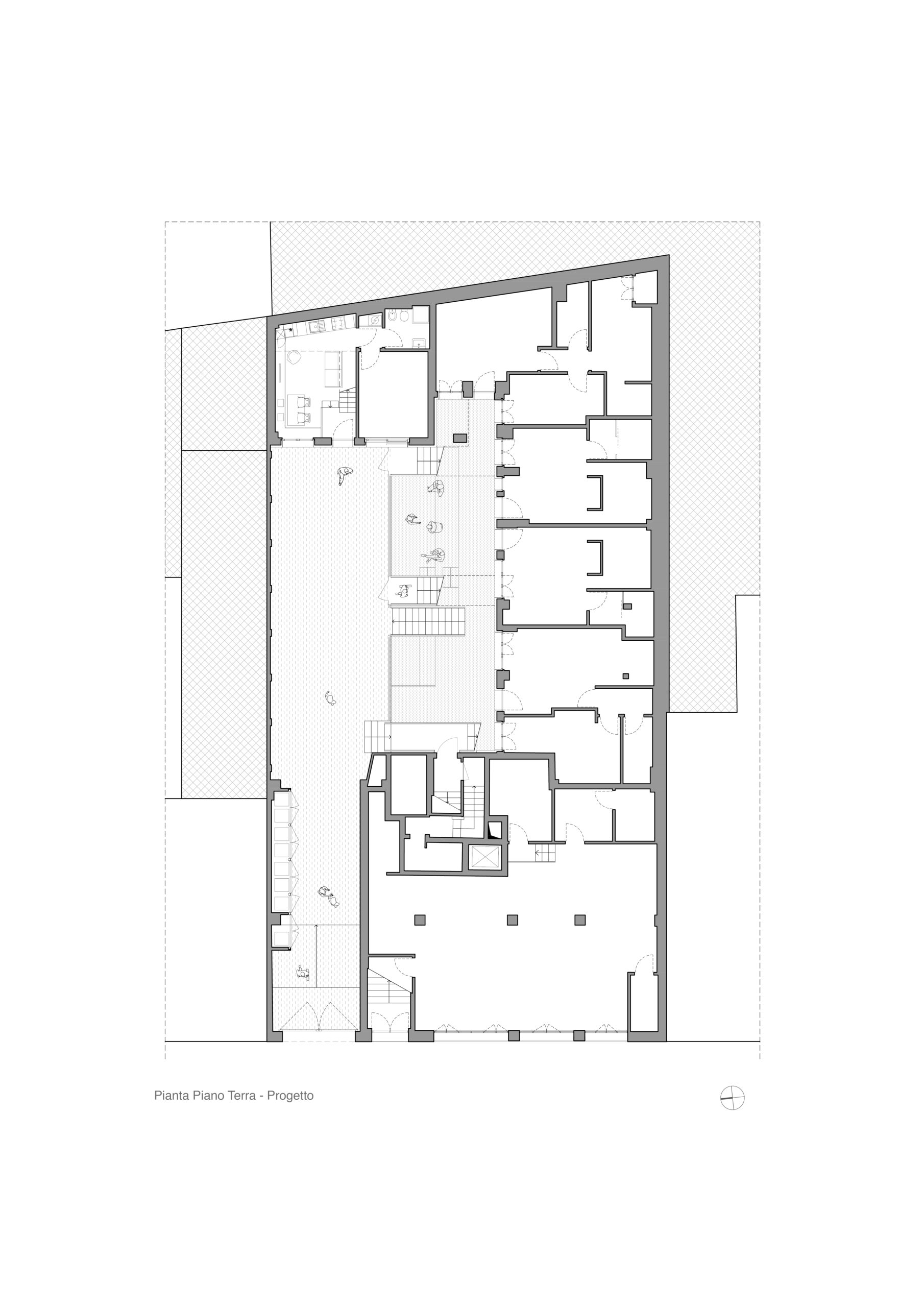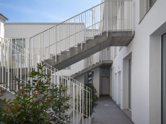 Il progetto interviene su un edificio a impianto a L che abbracciava due lati del cortile di un palazzo su strada e il principio del progetto è stata un attento rilievo dello stato di fatto. La strategia principale non è stata l’espansione volumetrica, ma la ridefinizione delle relazioni tra spazi interni ed esterni, la ridefinizione di nuovi ingressi e di un nuovo rapporto tra la corte e il costruito. L’operazione più incisiva riguarda il piano seminterrato, reso pienamente abitabile grazie all’abbassamento di una porzione della corte, trasformata in un patio ribassato articolato spazialmente da gradonate, sedute e superfici piantumate. Uno spazio prima residuale diventa così un luogo di vita condivisa, capace di mediare tra dimensione privata e collettiva, il cortile, sopraelevato che diventa una nuova piazza per gli abitanti.Il complesso ospita dieci unità abitative di piccolo e medio taglio – monolocali, bilocali e trilocali – tutte con accesso indipendente dal cortile, oltre a spazi comuni collocati sotto la corte: lavanderia, cantine, locale polifunzionale e ambienti di servizio. Un’ulteriore unità trova posto sulla terrazza, all’interno di un nuovo volume a falde che sostituisce i vecchi corpi tecnici e contribuisce a ricomporre l’immagine complessiva dell’edificio.Dal punto di vista architettonico, il progetto costruisce un linguaggio unitario attraverso superfici bianche, parapetti leggeri e grandi aperture vetrate che mettono in continuità visiva interni e spazio comune. La complessità volumetrica e altimetrica è governata con un disegno misurato, che restituisce ordine e riconoscibilità ricucendo un micro-frammento urbano con la città.