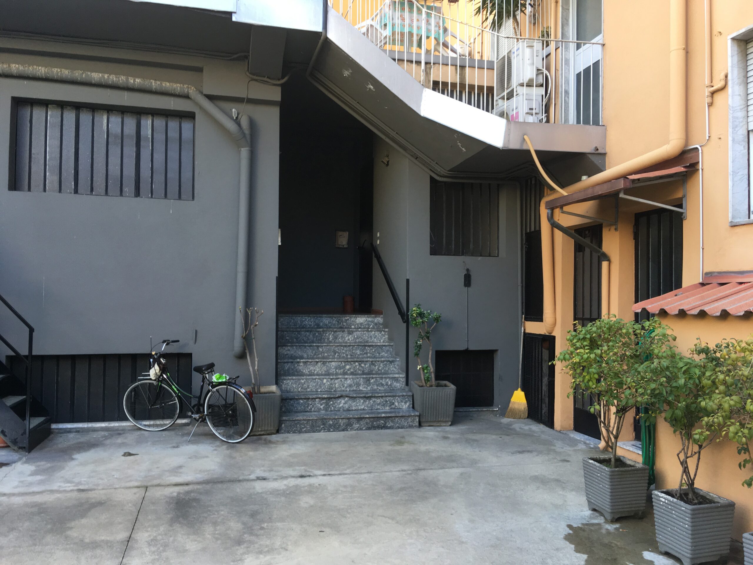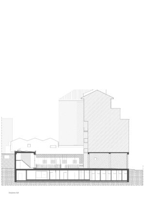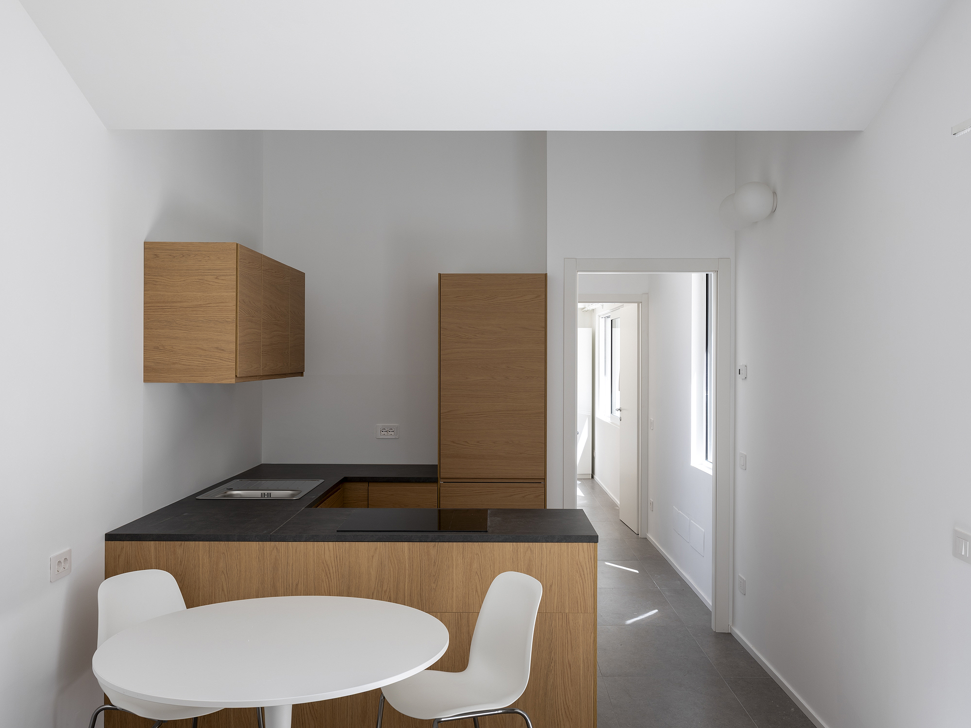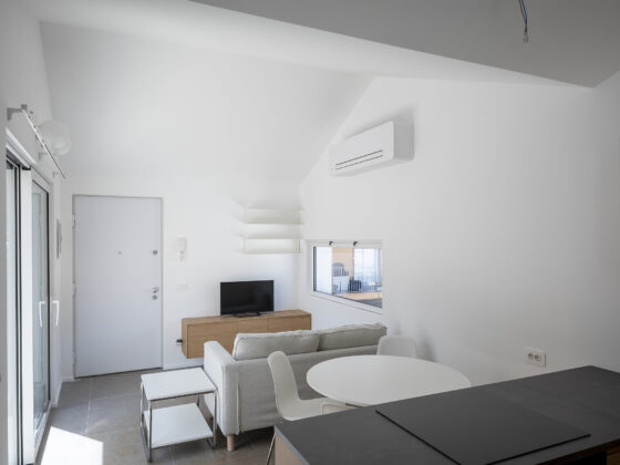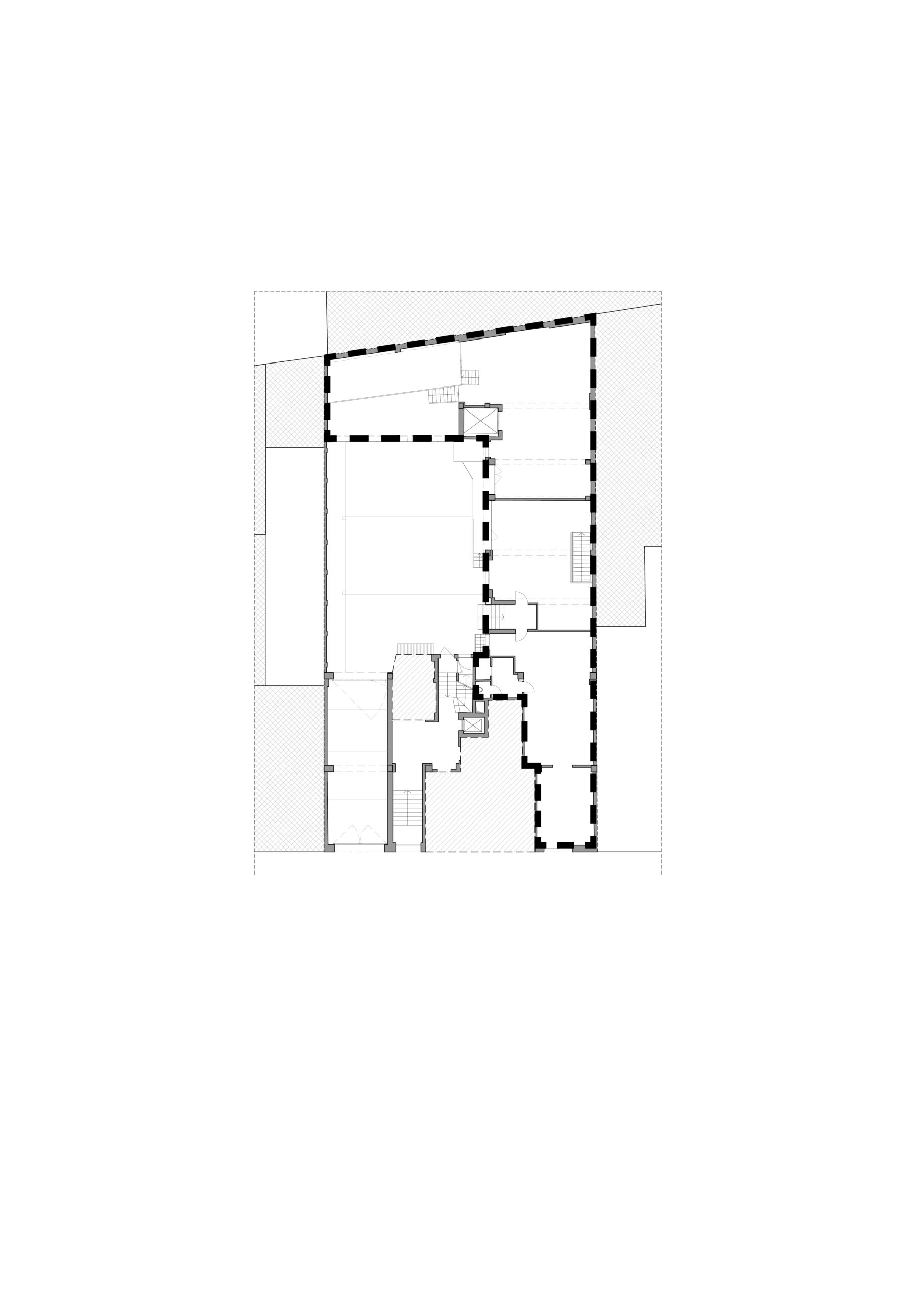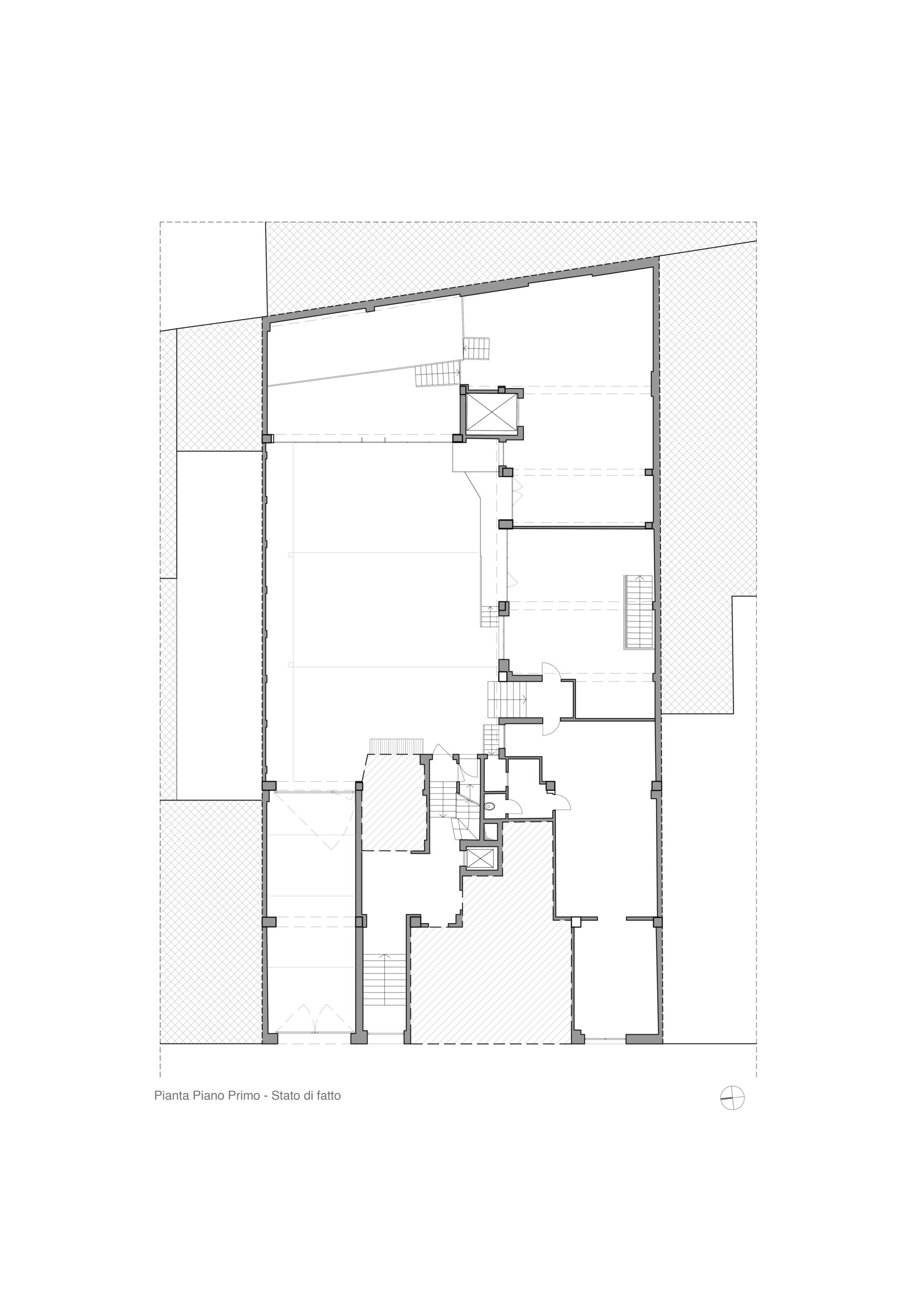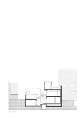 Il progetto interviene su un edificio a impianto a L che abbracciava due lati del cortile di un palazzo su strada e il principio del progetto è stata un attento rilievo dello stato di fatto. La strategia principale non è stata l’espansione volumetrica, ma la ridefinizione delle relazioni tra spazi interni ed esterni, la ridefinizione di nuovi ingressi e di un nuovo rapporto tra la corte e il costruito. L’operazione più incisiva riguarda il piano seminterrato, reso pienamente abitabile grazie all’abbassamento di una porzione della corte, trasformata in un patio ribassato articolato spazialmente da gradonate, sedute e superfici piantumate. Uno spazio prima residuale diventa così un luogo di vita condivisa, capace di mediare tra dimensione privata e collettiva, il cortile, sopraelevato che diventa una nuova piazza per gli abitanti.Il complesso ospita dieci unità abitative di piccolo e medio taglio – monolocali, bilocali e trilocali – tutte con accesso indipendente dal cortile, oltre a spazi comuni collocati sotto la corte: lavanderia, cantine, locale polifunzionale e ambienti di servizio. Un’ulteriore unità trova posto sulla terrazza, all’interno di un nuovo volume a falde che sostituisce i vecchi corpi tecnici e contribuisce a ricomporre l’immagine complessiva dell’edificio.Dal punto di vista architettonico, il progetto costruisce un linguaggio unitario attraverso superfici bianche, parapetti leggeri e grandi aperture vetrate che mettono in continuità visiva interni e spazio comune. La complessità volumetrica e altimetrica è governata con un disegno misurato, che restituisce ordine e riconoscibilità ricucendo un micro-frammento urbano con la città.
