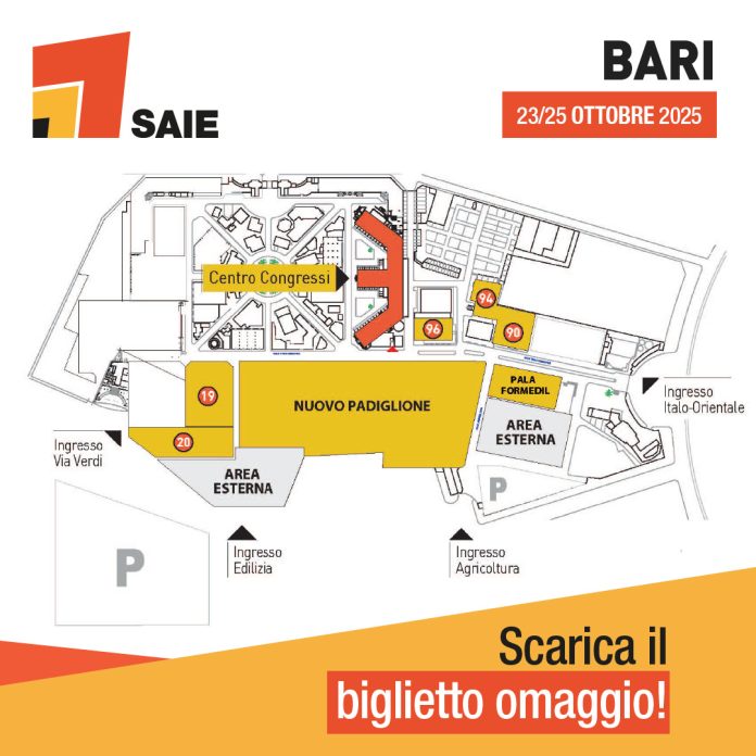 SAIE Bari 2025 (23-25 ottobre, Fiera del Levante) è l’appuntamento da non perdere per chi opera nella filiera delle costruzioni. Il biglietto gratuito è riservato ai professionisti del settore e consente un ingresso omaggio alla fiera. È possibile condividere il link di registrazione con colleghi e partner per vivere insieme l’esperienza di SAIE Bari 2025.