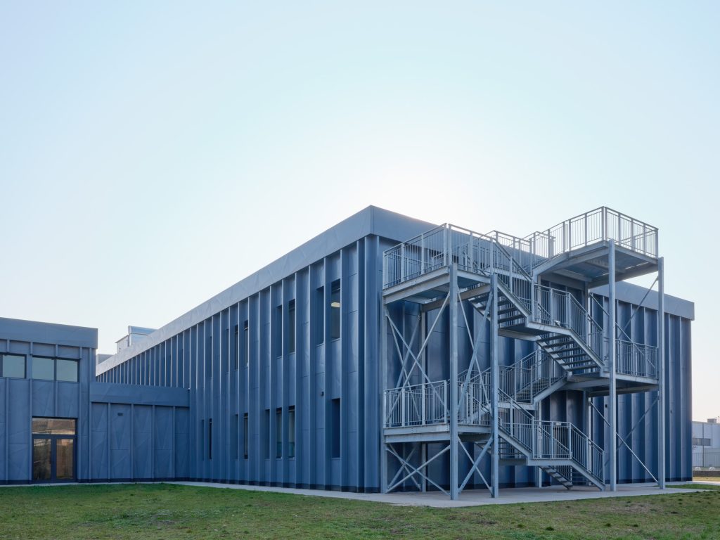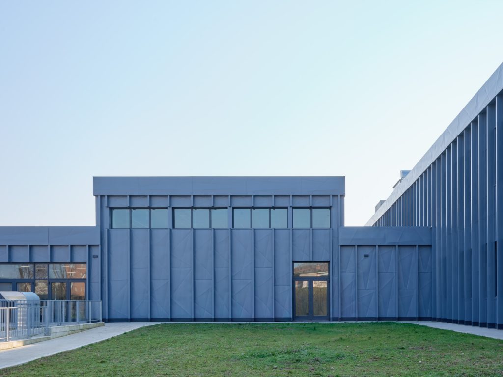 l colore blu guida l’identità della nuova scuola primaria Don Milani. Il rivestimento esterno è realizzato in zinco-titanio zintek® Blu Mediterraneo della collezione The Color Line, una pelle vibrante che dialoga con la luce e con il paesaggio circostante.