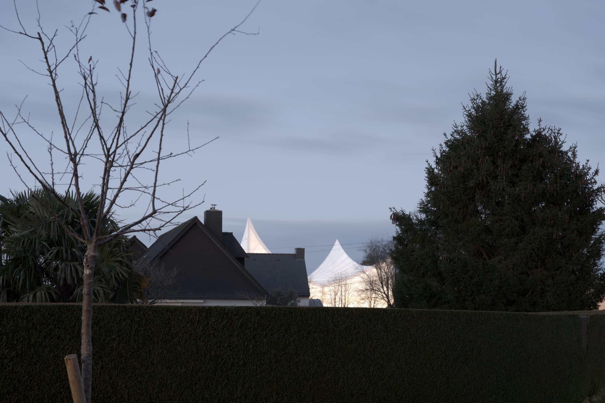 La copertura tessile, retroilluminata nelle ore serali, trasforma il volume della palestra in una lanterna urbana, enfatizzando il ruolo civico dell’edificio e la sua funzione di nuovo punto di riferimento per la comunità.
