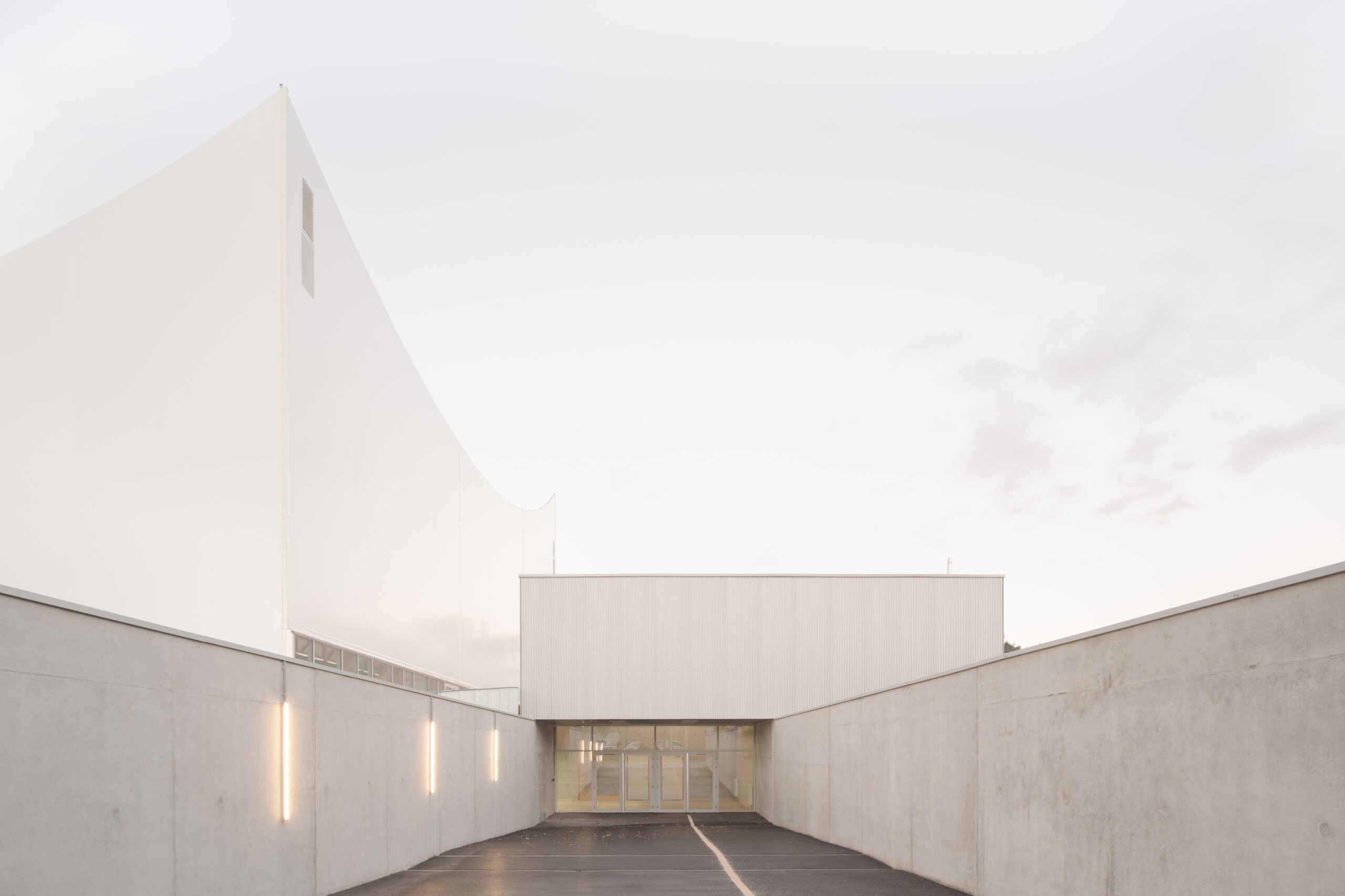 Il sistema di accessi si sviluppa su due quote: a livello inferiore, il percorso pubblico conduce direttamente alla hall e agli spazi collettivi; a livello superiore, una passerella-belvedere attraversa l’edificio dall’esterno e si connette alle tribune della sala sportiva, offrendo una relazione visiva diretta con il campo.