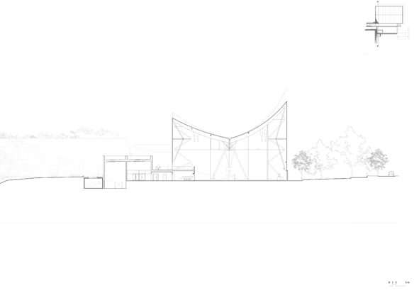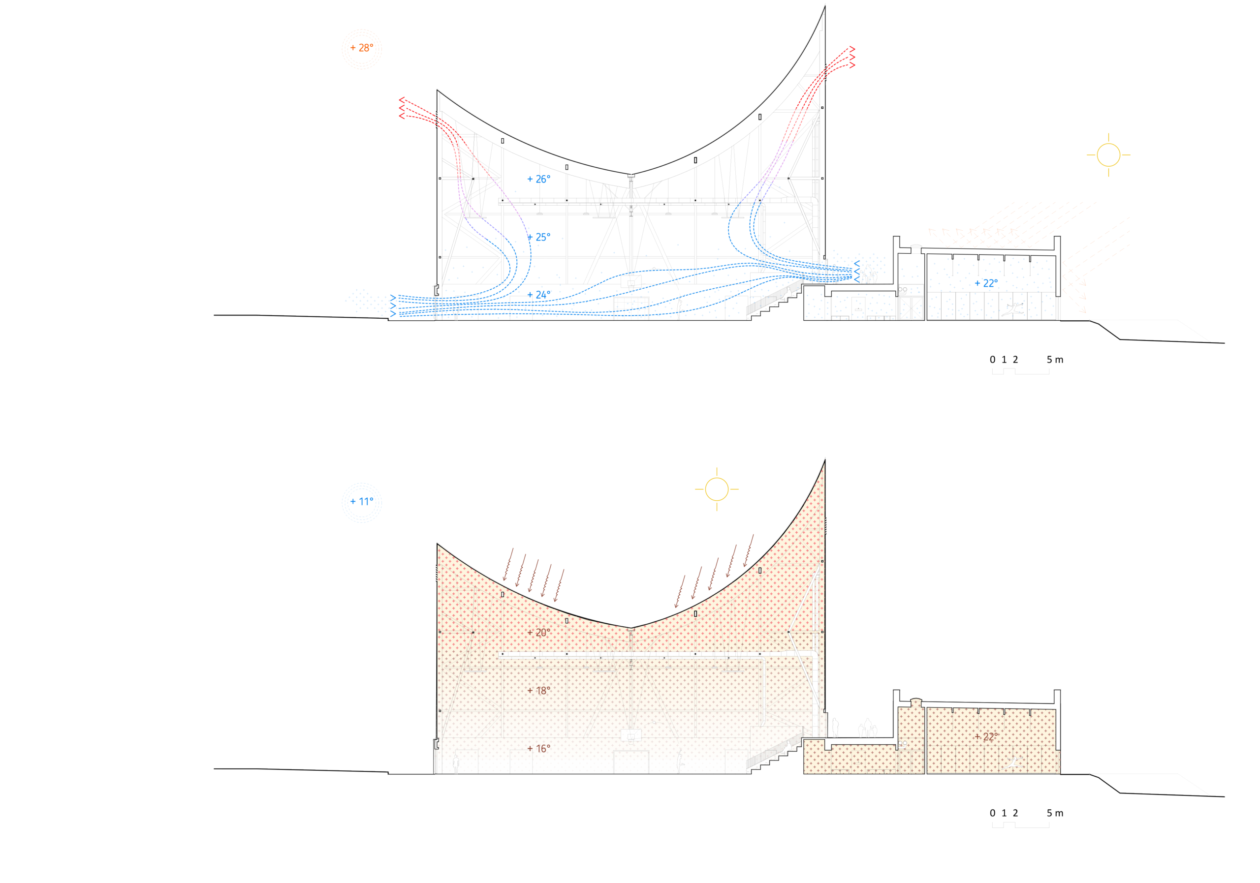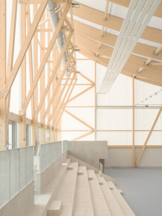 L’impianto architettonico si articola in due volumi distinti: a nord la grande sala multisport, destinata a competizioni di livello dipartimentale, e a sud il corpo compatto che accoglie gli spazi per danza e squash. La separazione funzionale corrisponde a una differenziazione costruttiva: da un lato un volume climatizzato e massivo, dall’altro una struttura leggera coperta da una membrana tessile tensionata, definita da quattro punti invertiti, che ottimizza il comportamento ambientale dell’involucro riducendo il surriscaldamento estivo.