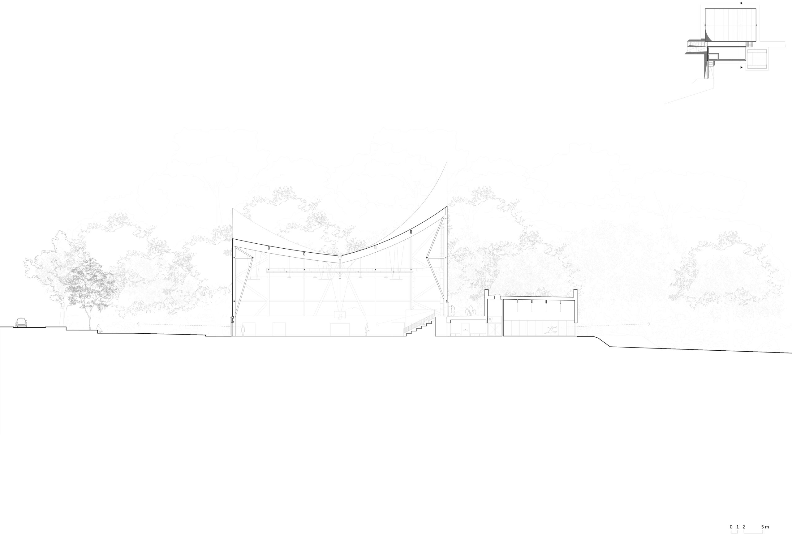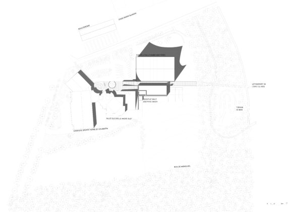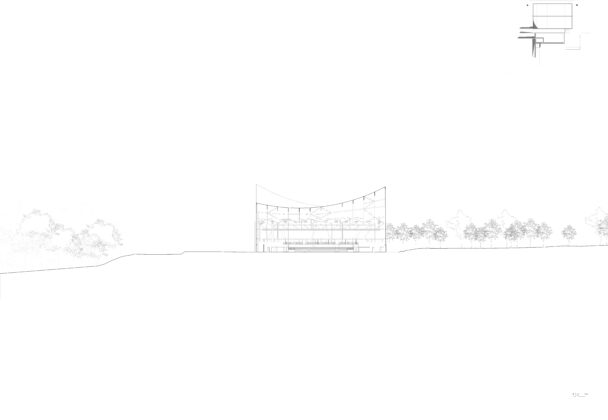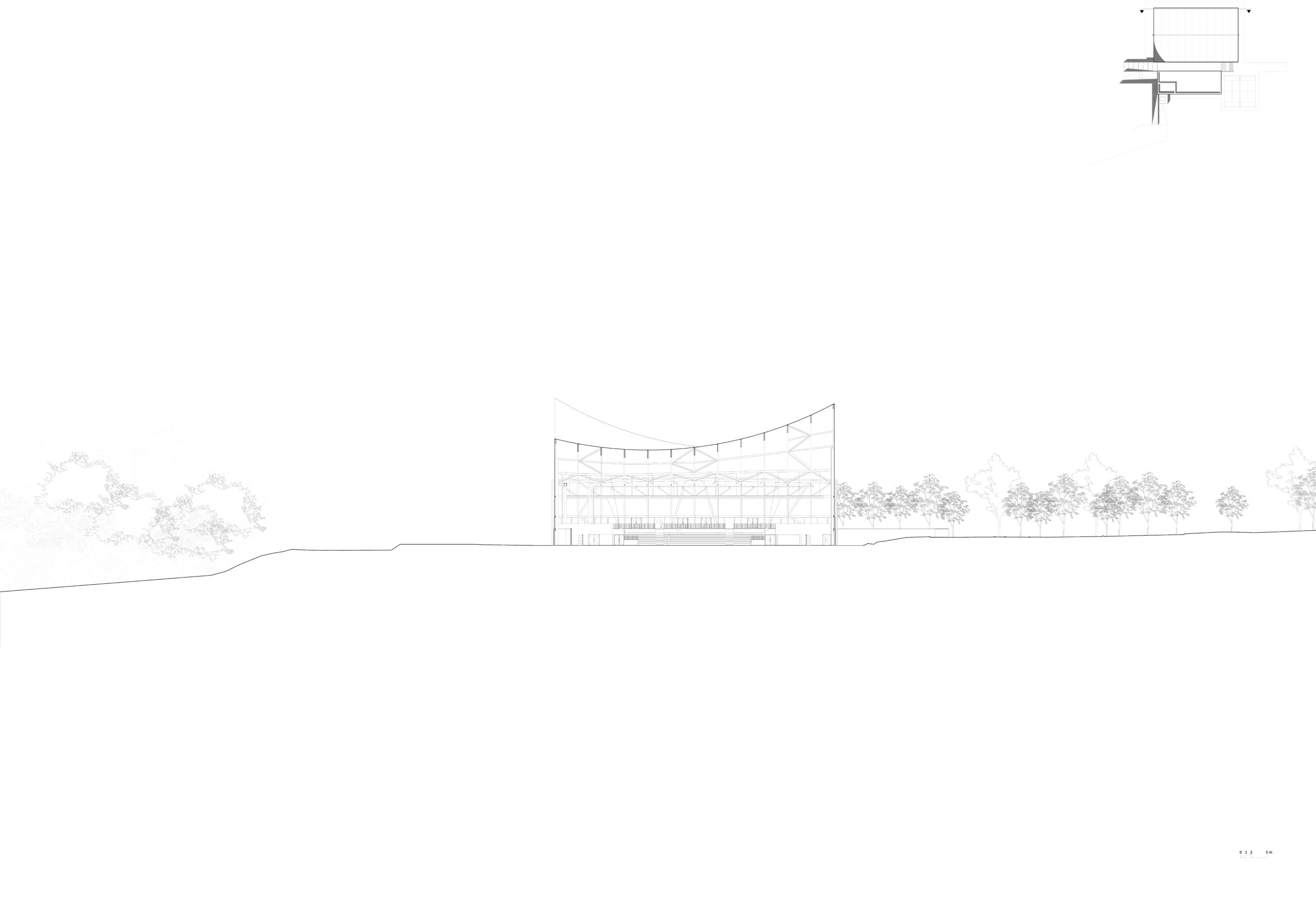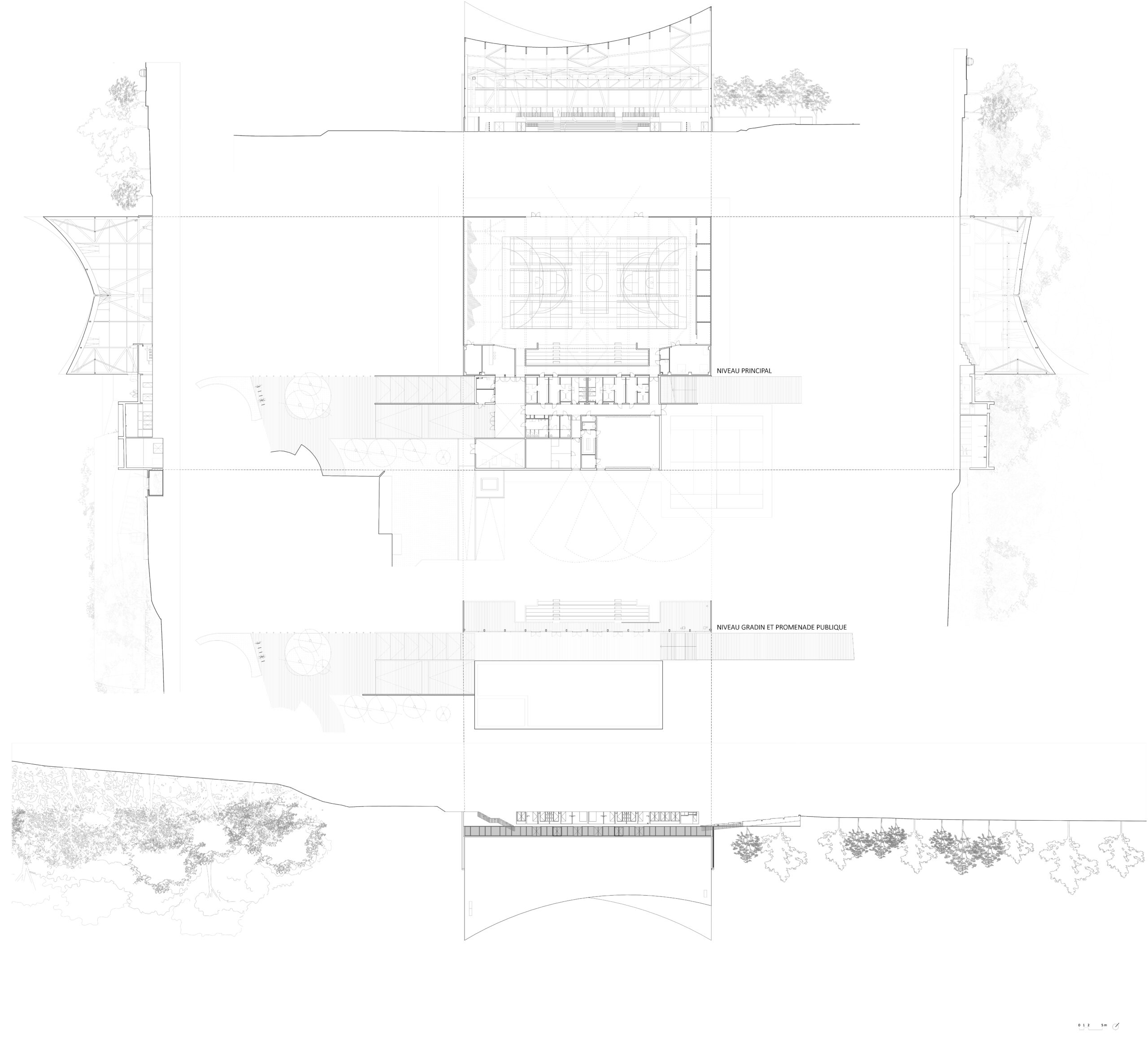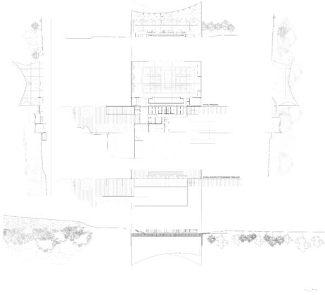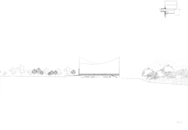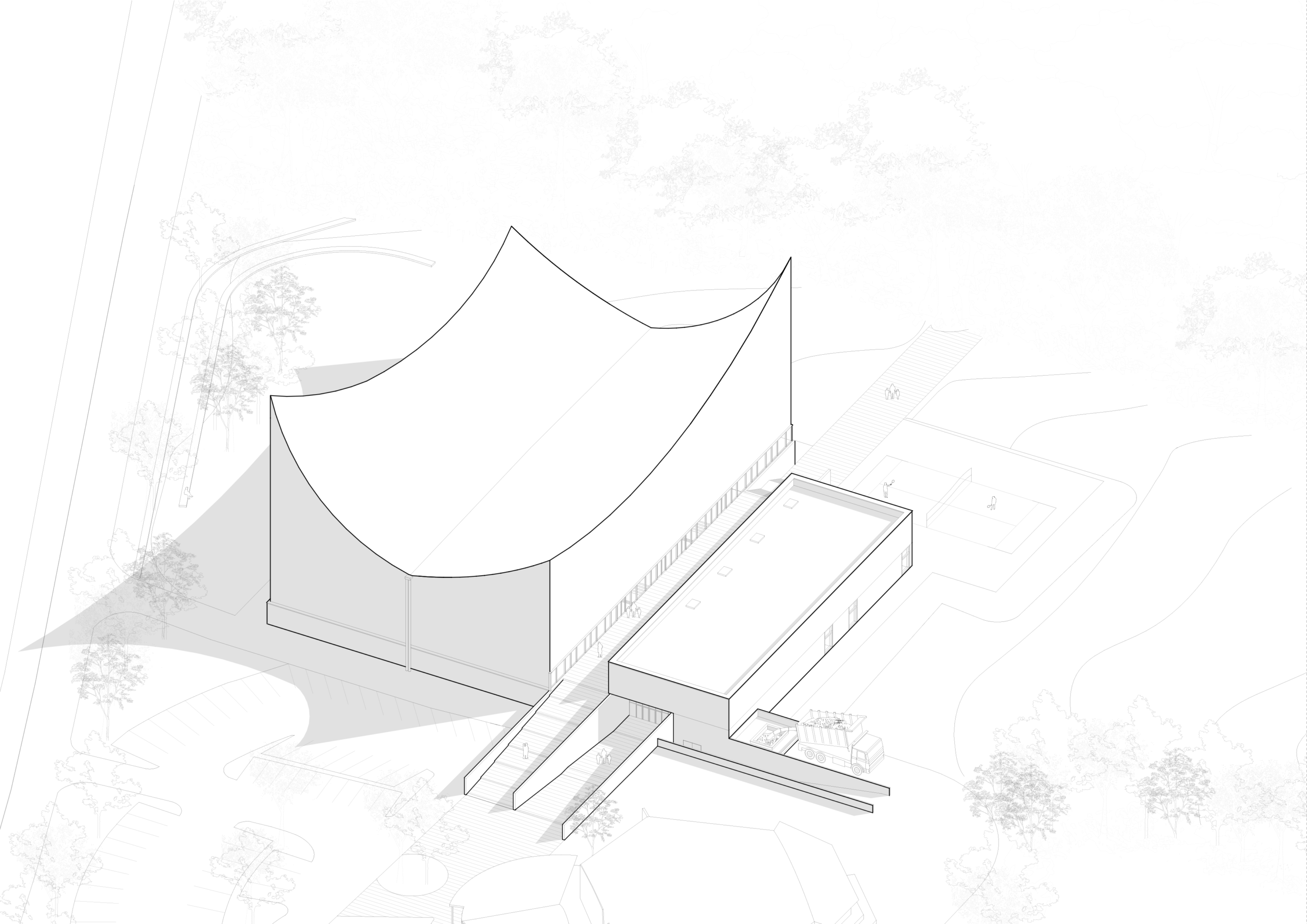 L’intervento si inserisce in un sistema frammentato di attrezzature esistenti – complesso sportivo, centro culturale, campi e infrastrutture – proponendo una strategia di ricomposizione spaziale basata sull’introduzione di un asse pedonale strutturante. Questo percorso attraversa il nuovo edificio a due livelli, configurandosi come dispositivo distributivo e urbano al tempo stesso, capace di connettere le diverse funzioni e riattivare le relazioni con i quartieri limitrofi.