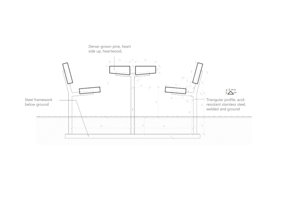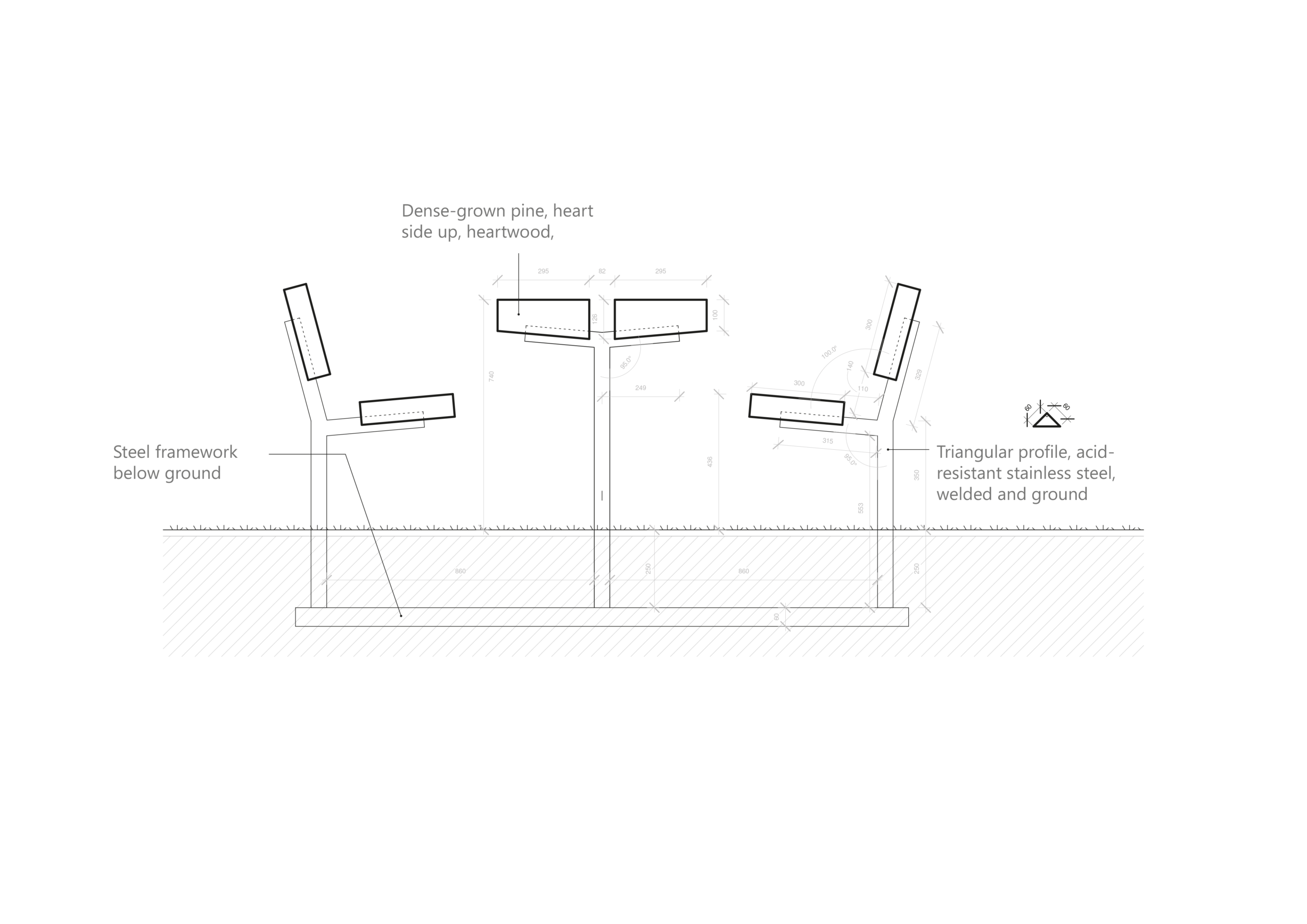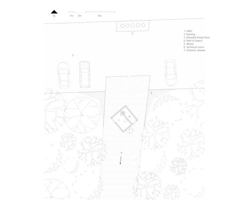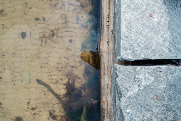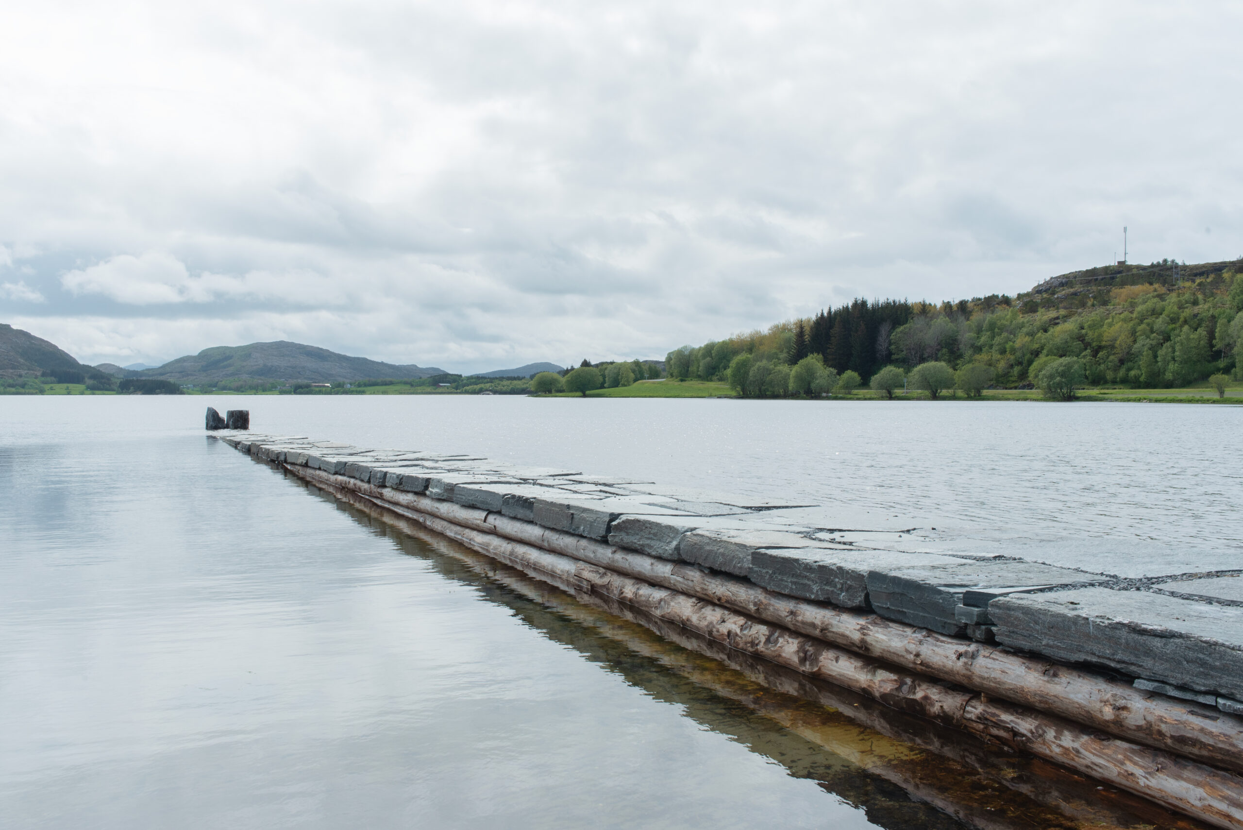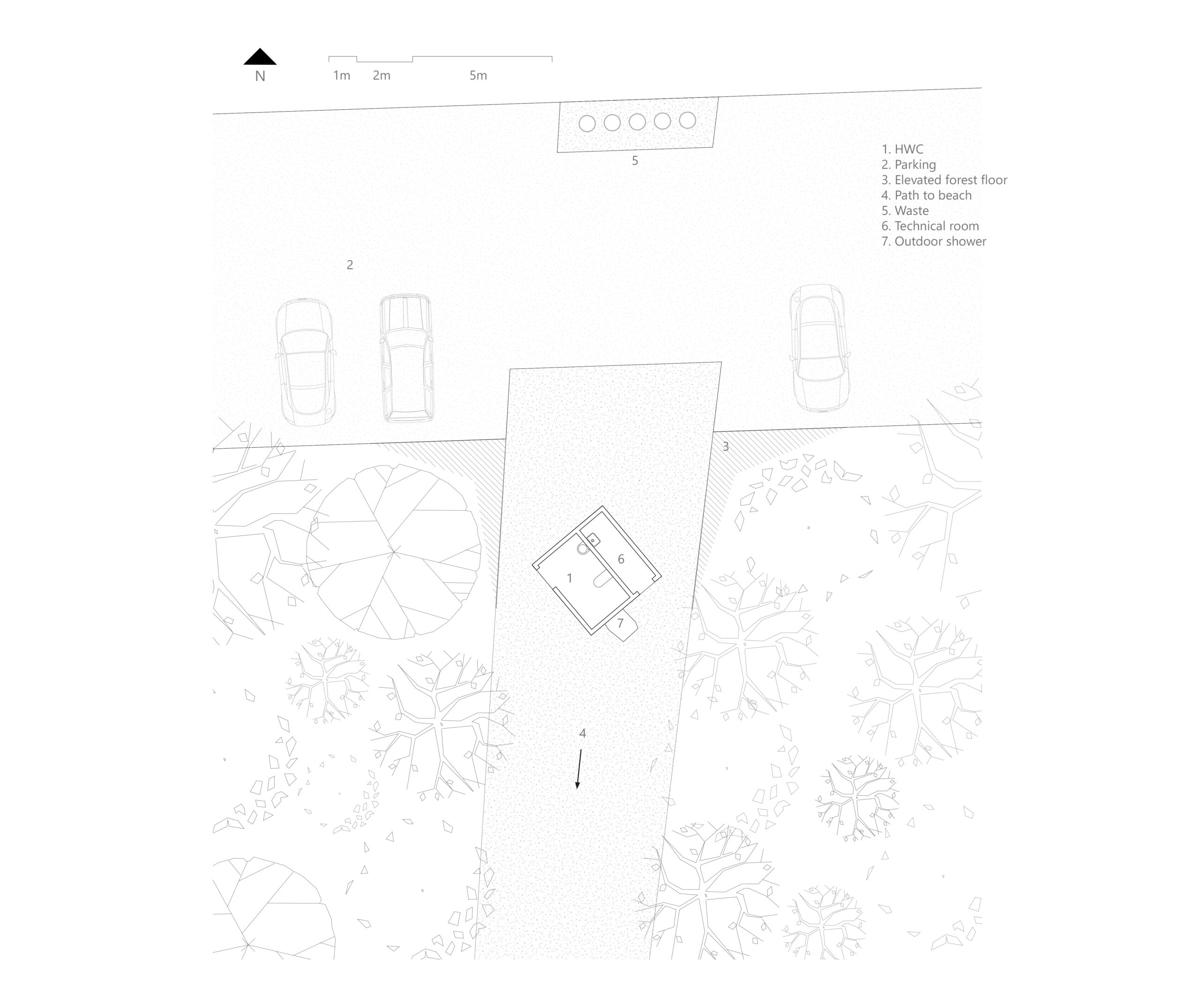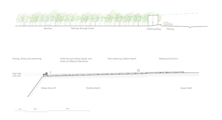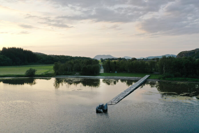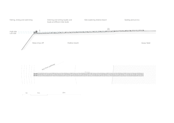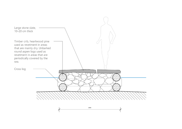 Elemento centrale del progetto è la realizzazione di un molo inclinato in legno e pietra, reinterpretazione contemporanea della tradizionale vorr norvegese. Questa struttura, oltre a consentire l’accesso all’acqua in ogni condizione di marea, definisce lo spazio della baia, protegge la riva e diventa dispositivo paesaggistico capace di registrare le variazioni stagionali del livello dell’acqua. Allo stesso tempo, il molo si configura come una superficie pubblica multifunzionale: luogo per la balneazione, la pesca, la sosta e l’incontro.
