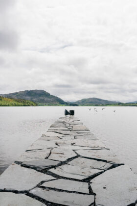 La scelta dei materiali riflette un dialogo tra tradizione e contemporaneità. Il molo è realizzato con una struttura in legno riempita con pietre locali e rivestita in lastre di ardesia, secondo tecniche costruttive storiche, mentre l’edificio di servizio è in alluminio sabbiato, prodotto con lavorazioni industriali. Due linguaggi distinti che convivono all’interno di un’unica strategia progettuale, basata sulla durabilità e sulla coerenza con il contesto.