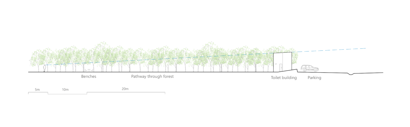 Il progetto costruisce una sequenza spaziale calibrata, che accompagna il visitatore dal parcheggio attraverso il bosco fino all’apertura sul lago. Il percorso, tracciato lungo un asse preciso, utilizza la prospettiva come strumento compositivo: la punta del molo diventa un punto focale visibile già dall’ingresso nel bosco, mentre un piccolo edificio di servizio in alluminio segna l’accesso e introduce un contrappunto contemporaneo rispetto alla matericità tradizionale della struttura principale.