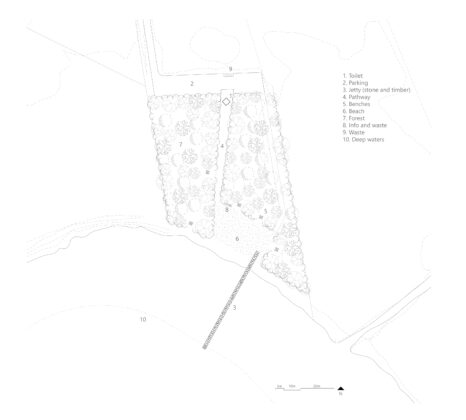 Situato all’estremità settentrionale di un bacino d’acqua salmastra, il progetto riattiva una piccola baia da tempo trascurata, trasformandola in area per il tempo libero, la sosta e l’incontro. L’intervento si inserisce con discrezione nel paesaggio agricolo circostante, valorizzando le qualità esistenti del sito — il rapporto tra acqua, campi coltivati e un fitto boschetto — e ristabilendo una continuità tra dimensione naturale e uso collettivo.