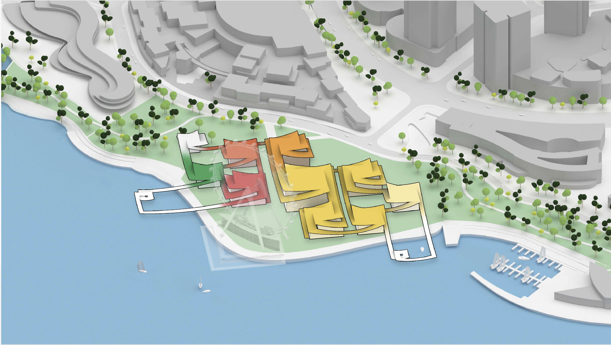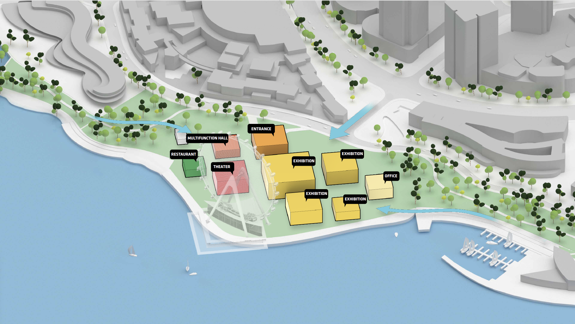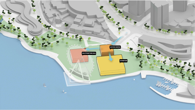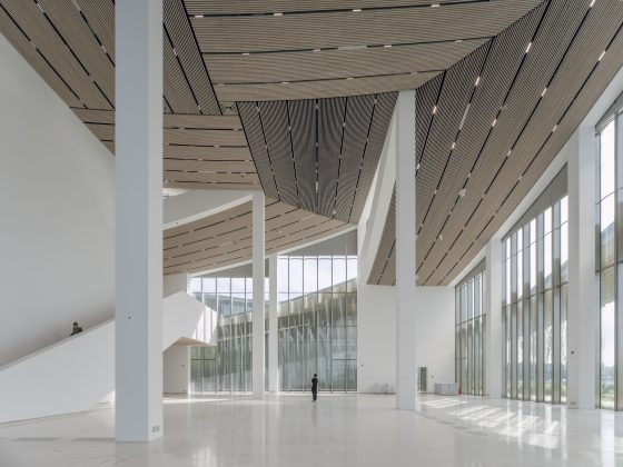 Rivestito in vetro curvato e acciaio inox dalle tonalità calde, l’edificio dissolve i confini tra architettura e natura attraverso riflessi di acqua, cielo e vegetazione, mentre ponti e tunnel sopra e sotto terra offrono flessibilità espositiva e stagionale, accompagnando il visitatore in una sequenza di giardini e corti che intrecciano arte, storia e paesaggio. L’ingresso si apre su un’ampia piazza che dialoga con le passerelle sul lago, mentre all’interno la luce naturale, filtrata da lucernari e superfici verticali vetrate, modula spazi monumentali e intimi, tra grandi sale espositive, un teatro, un ristorante e ambienti multifunzionali, tutti uniti da un percorso continuo che si dirama in itinerari secondari. All’esterno, il progetto del paesaggio costruisce una progressione sensoriale dal duro al morbido, dalla pietra al verde fino alle piante acquatiche che annunciano l’arrivo al bordo del lago, mentre soluzioni sostenibili come ombreggiamento passivo, ventilazione naturale e materiali locali consentono all’edificio di perseguire la certificazione GBEL 2-Star.