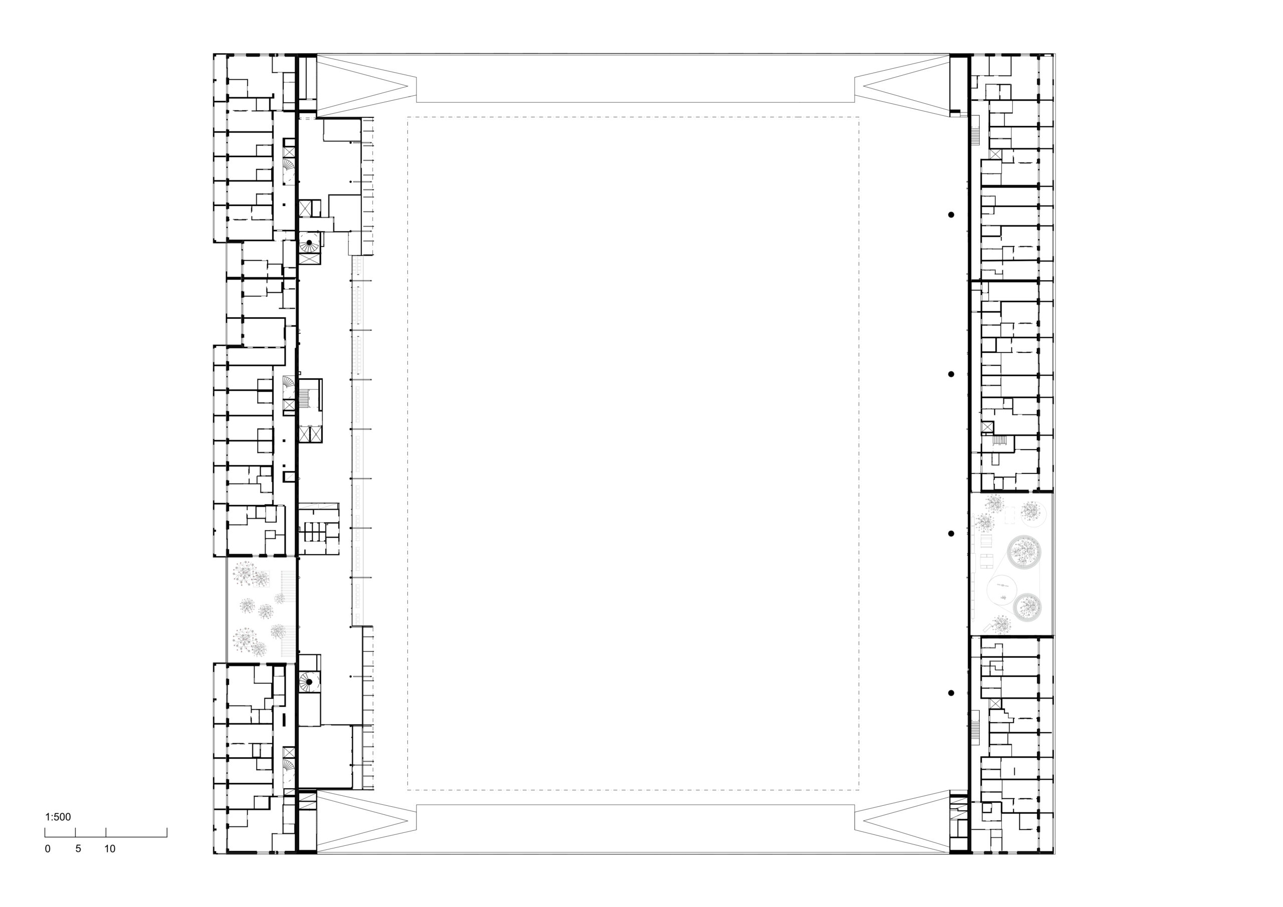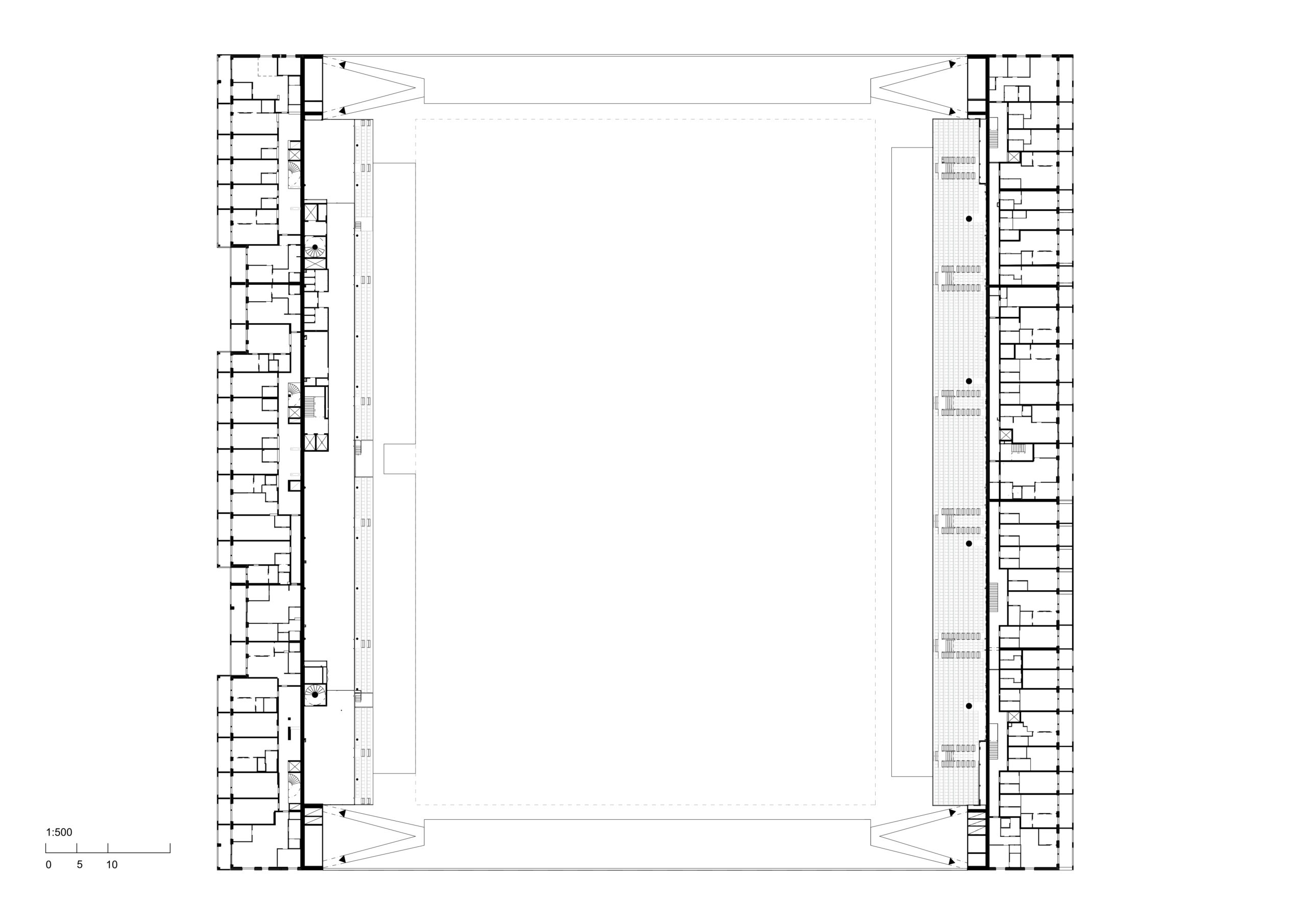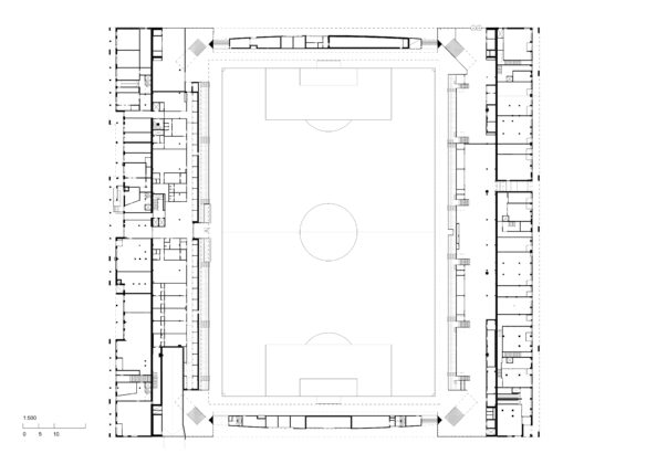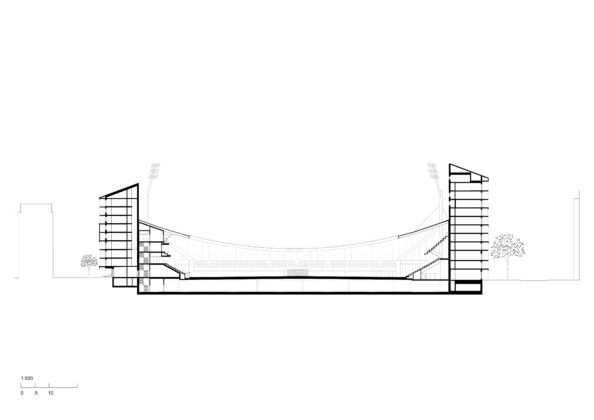 Elemento iconico del progetto è la grande copertura ad arco sospesa in acciaio che attraversa l’intero isolato da est a ovest. Questa struttura non solo definisce l’immagine dello stadio nel paesaggio urbano, ma si estende sui tetti degli edifici residenziali, unificando formalmente le diverse parti del complesso e dichiarandone il carattere pubblico. La geometria della copertura è studiata per evitare l’ombreggiamento del campo e degli spazi adiacenti, dimostrando un’attenta integrazione tra forma architettonica, prestazioni ambientali e comportamento strutturale.