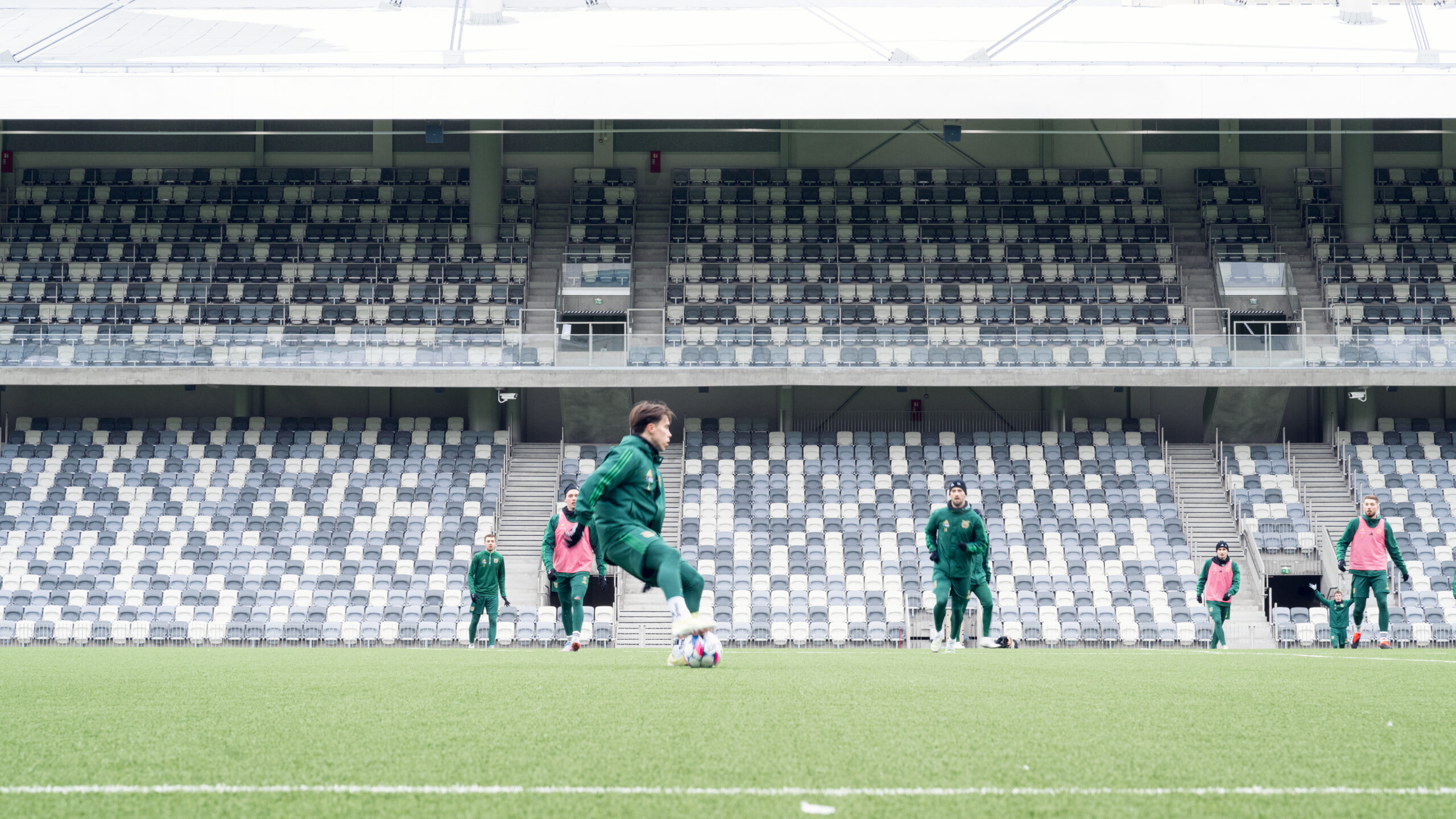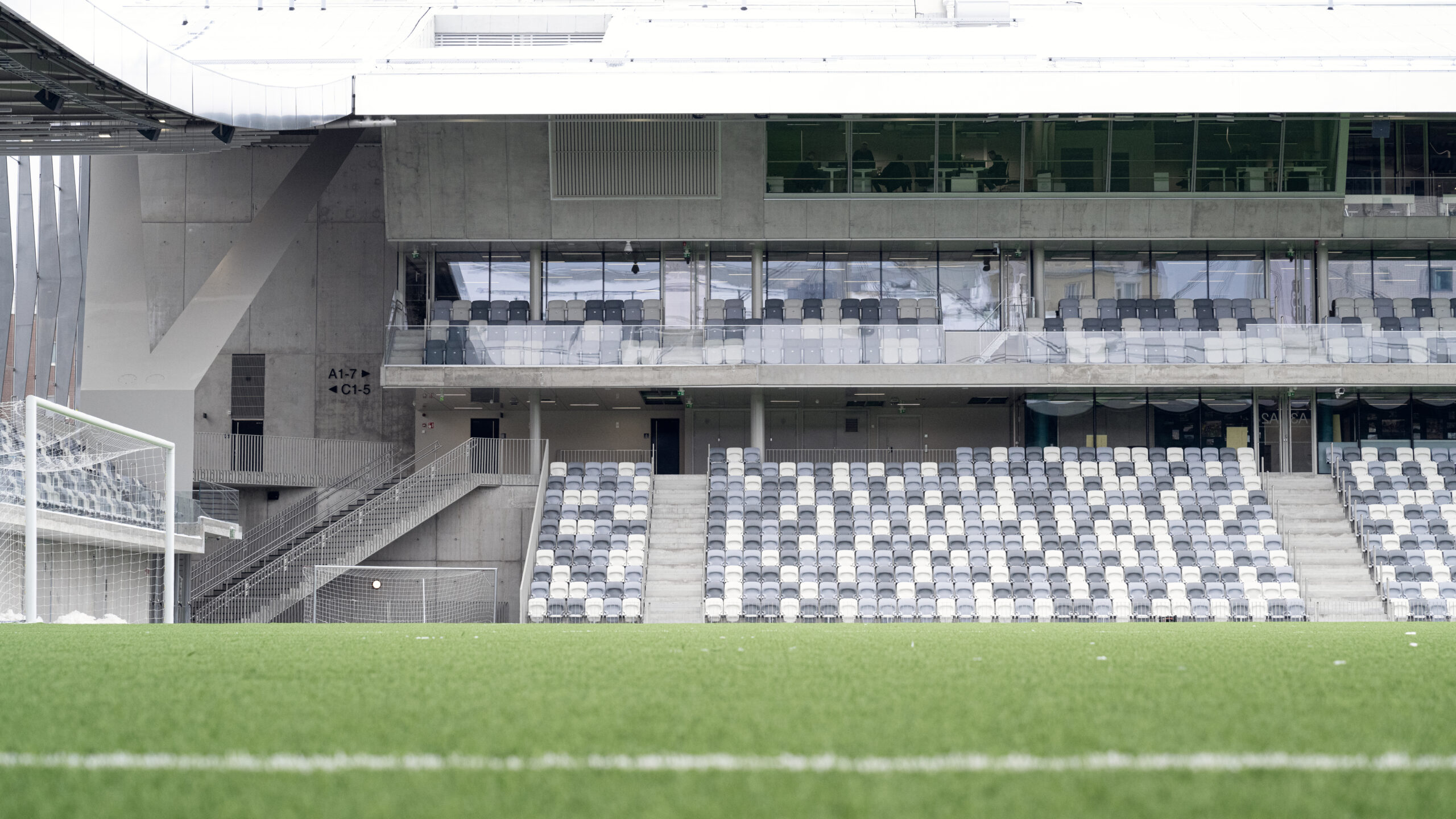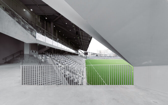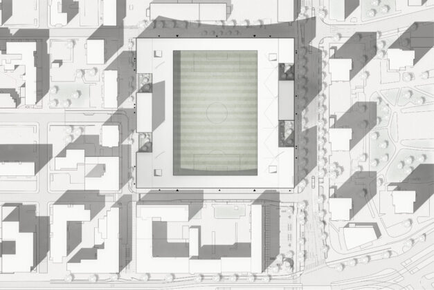 Il risultato è un edificio ibrido che può essere letto come una vera e propria “città in miniatura”: lo stadio da 8.000 posti, conforme agli standard UEFA di categoria 4, è inserito all’interno di un sistema edilizio che comprende cinque edifici residenziali, un centro commerciale e parcheggi interrati. Le gradinate sorgono direttamente dal bordo del campo, garantendo una visibilità totale da ogni posto a sedere, mentre gli ingressi vetrati proteggono il terreno di gioco dal vento mantenendo una forte continuità visiva e spaziale con l’esterno. L’impianto è inoltre concepito per ospitare fino a 15.000 persone in occasione di concerti ed eventi, ampliandone significativamente l’uso nel tempo.