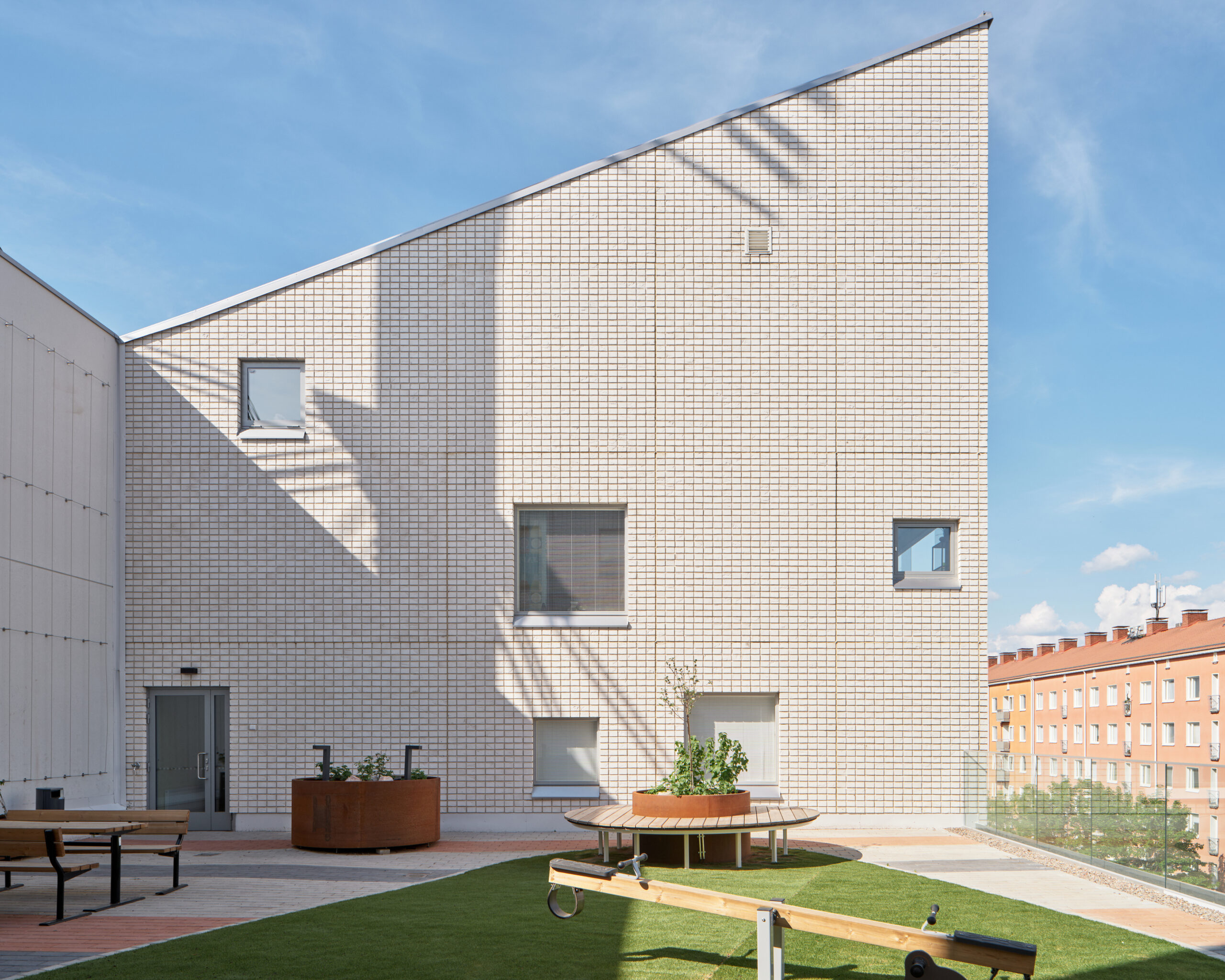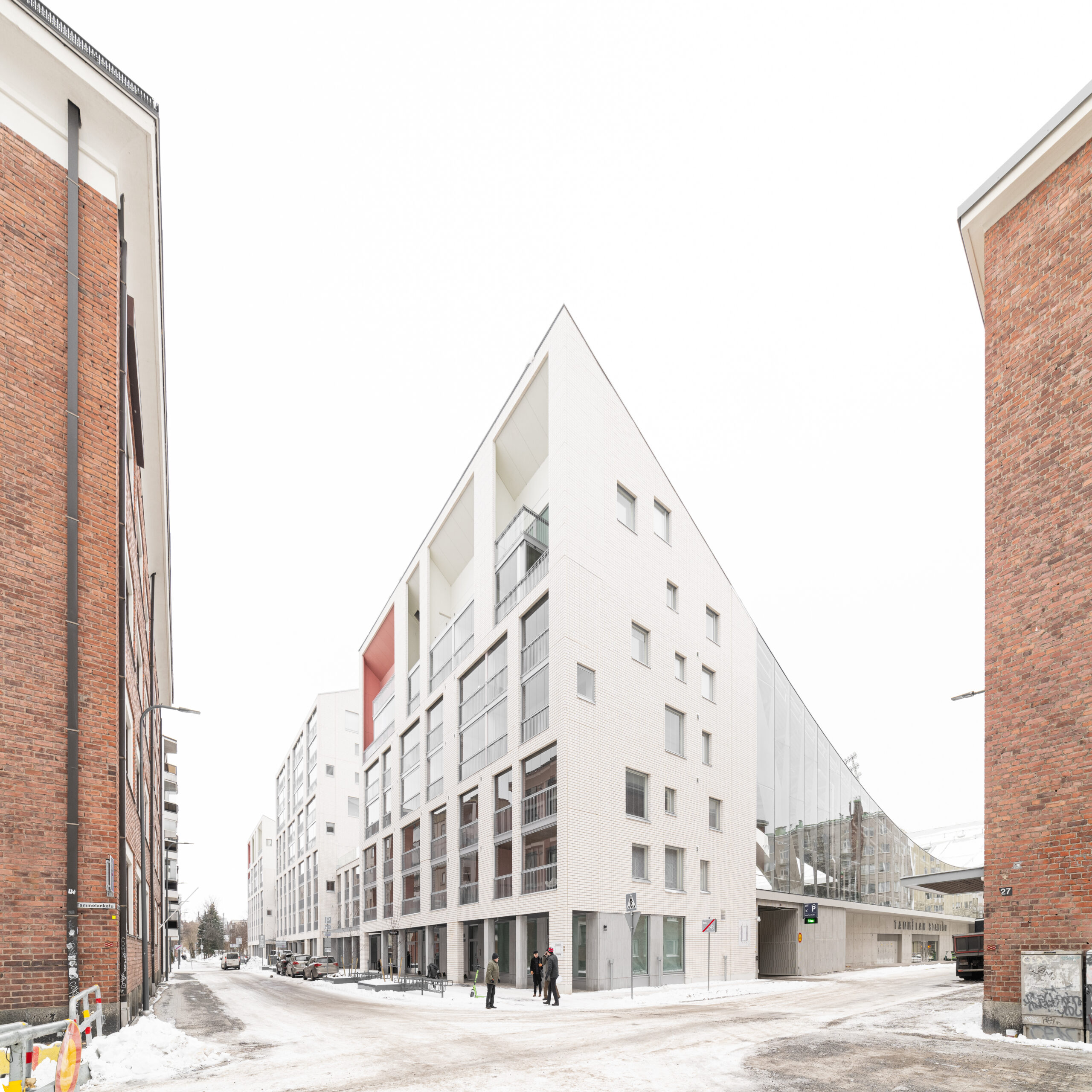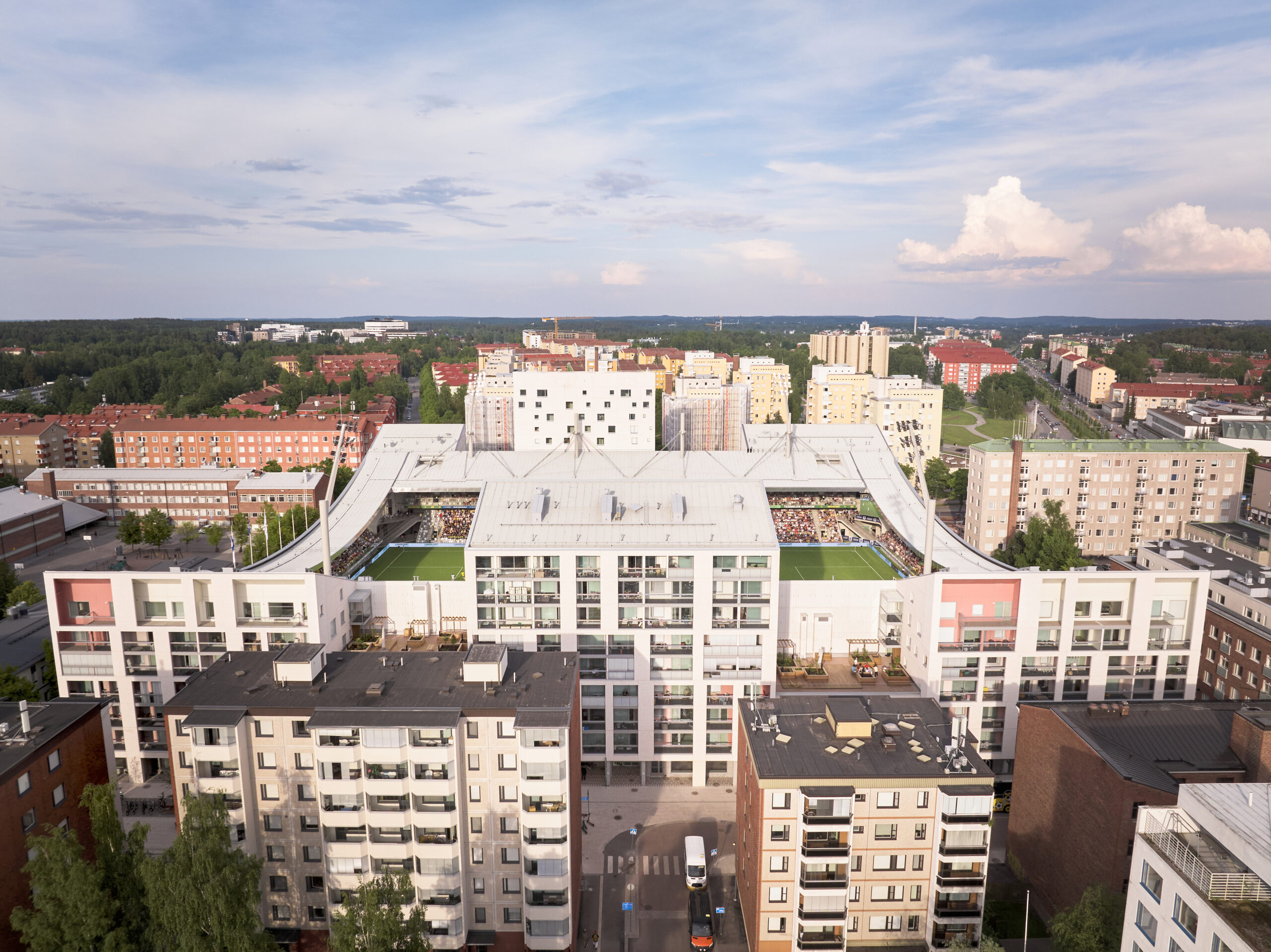 Progettato da JKMM Architects, il Tammela Stadium rappresenta il primo stadio ibrido per il calcio realizzato in Finlandia e un caso emblematico di integrazione tra architettura sportiva, residenza e spazio pubblico. Situato nel quartiere di Tampere, l’intervento – candidato per gli EUmies Awards – si inserisce in un isolato urbano compatto e ad alta densità, dando forma a un organismo complesso che combina infrastruttura sportiva, edifici abitativi, funzioni commerciali e servizi collettivi senza alterare la struttura storica del luogo.