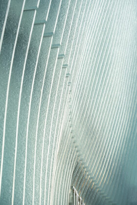 L’edificio si distingue per una facciata composta da sottili pinne in vetro traslucido, che si sviluppano lungo tutta l’altezza dei quattro livelli. Questi elementi verticali, caratterizzati da curvature morbide e continue, generano una pelle architettonica fluida e vibrante, capace di trasformare l’immagine dell’edificio in relazione alla luce e al punto di osservazione. L’ispirazione formale deriva dai gioielli disegnati da Elsa Peretti, in particolare dalla celebre Bone Cuff, tradotta in architettura attraverso un sistema tridimensionale che enfatizza la plasticità e il movimento della superficie. Il risultato è una facciata che si comporta come un dispositivo ottico: la sovrapposizione delle pinne amplifica gli effetti luminosi, generando riflessi, trasparenze e scorci visivi verso l’interno.