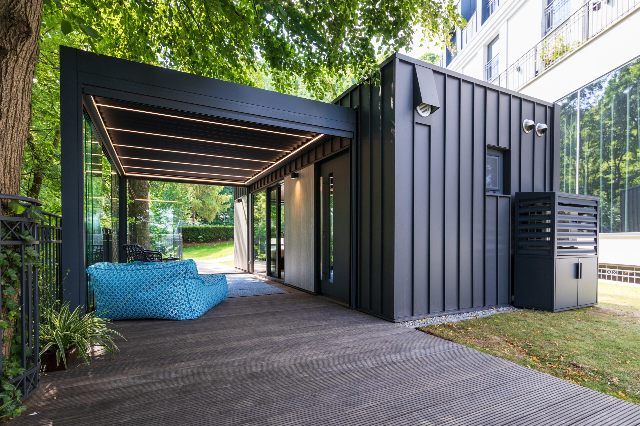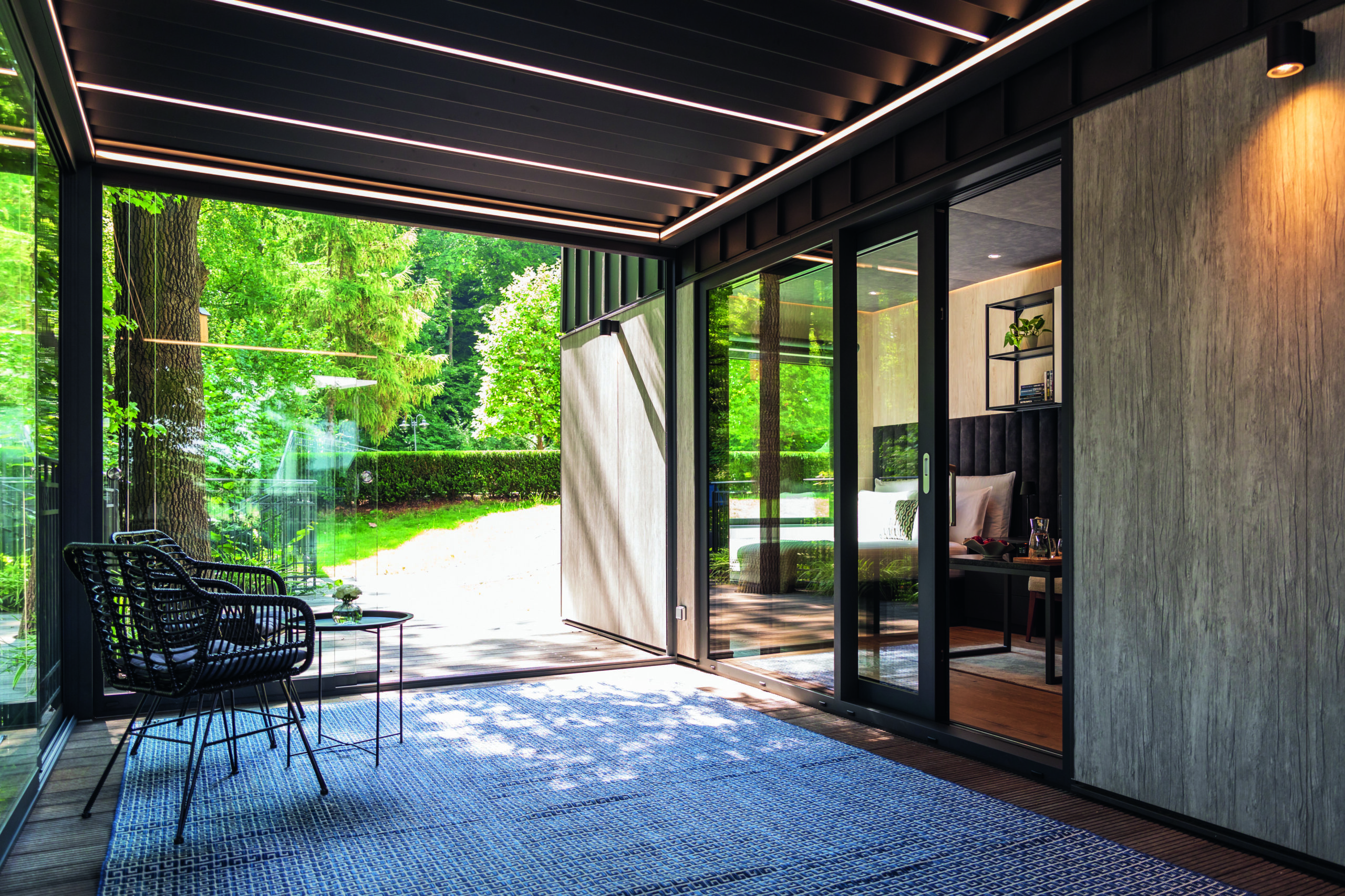Il sistema di ECHO è progettato per prevenire il surriscaldamento dello spazio coperto durante la stagione estiva. Le schermature solari di tipo zip screen non donano solo privacy, ma aiutano a non creare all’interno un caldo eccessivo e proteggono dagli insetti, laddove invece il sistema Slide Glass va a creare una tamponatura a vetri che crea continuità fra interno ed esterno e che offre una vista panoramica. Infine, la dotazione con sensori meteorologici, che azionano in automatico la pergola ECHO, favorisce una gestione funzionale del sistema in ogni situazione atmosferica, soprattutto in quella caratterizzata da estrema variabilità.