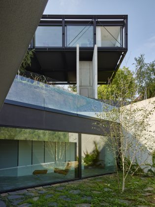 L’ingresso avviene attraverso un tunnel sotterraneo collegato al garage di 135 mq, dove trovano posto anche uno studio e una zona fitness. Dal tunnel si raggiunge un ascensore che distribuisce i diversi livelli: quello residenziale e quello tecnico. Il cuore della villa è il grande soggiorno con cucina e pranzo, affacciato su una terrazza a sud che crea continuità con il giardino superiore, più soleggiato e attrezzato con una piscina. Le ali laterali del ponte ospitano le camere dei figli e, sul lato opposto, la suite padronale con bagno. Le strutture metalliche restano volutamente esposte, come richiesto dai progettisti e dal committente, lasciando che la carpenteria e i pilastri grezzi diventino parte dell’identità visiva dell’opera.
