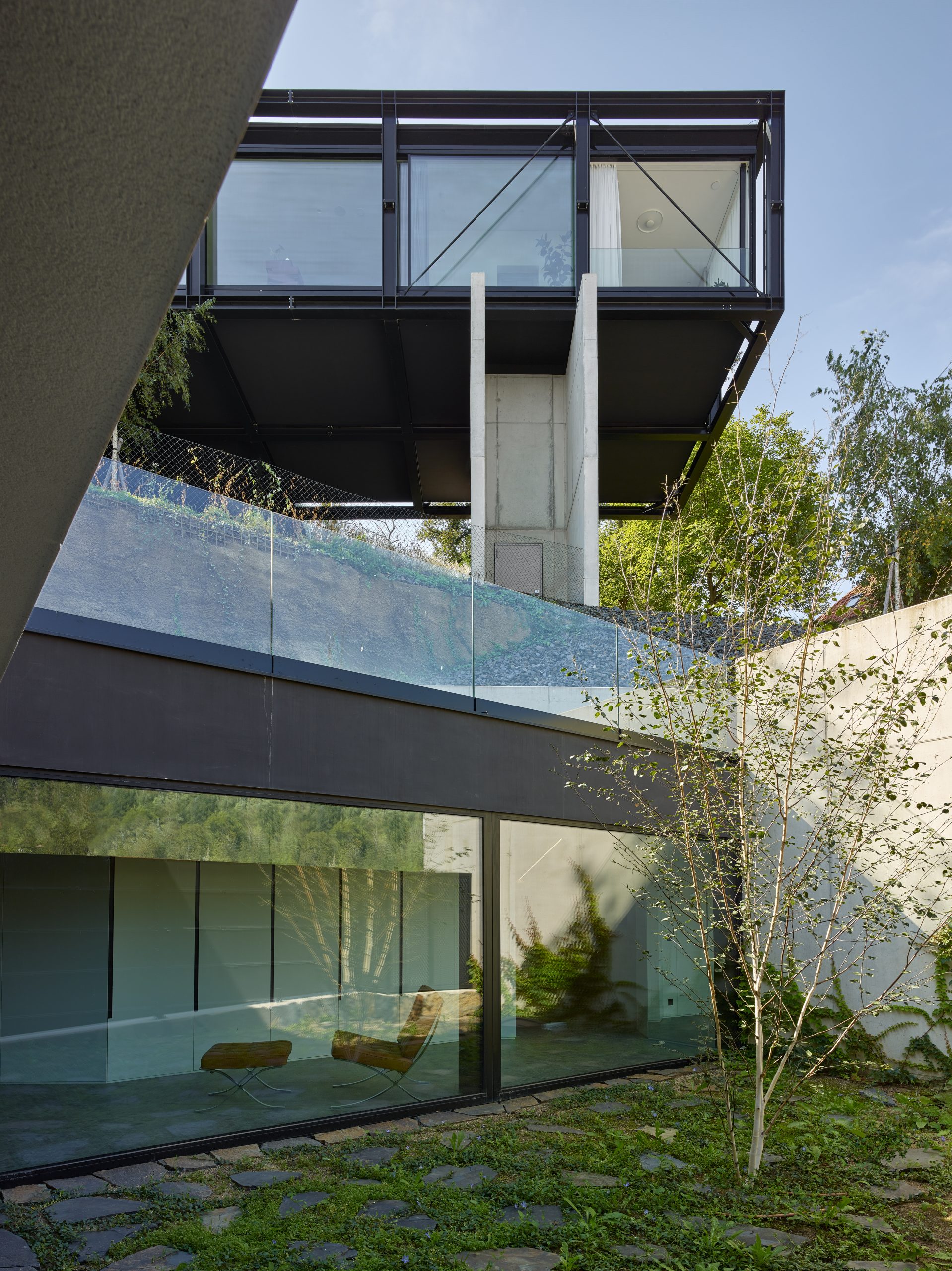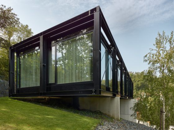 Il progetto affronta i limiti della proprietà – un versante settentrionale ombreggiato e un forte dislivello – trasformandoli in opportunità: la casa viene “sollevata” e posizionata nella parte più alta del lotto, sospesa su una struttura a ponte sostenuta da pilastri. Una scelta che semplifica l’accesso e apre la vista verso sud, abbracciando la valle della Berounka, le colline carsiche boeme e persino lo skyline di Praga.